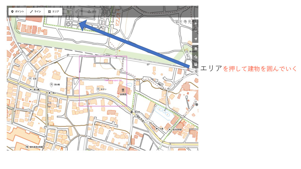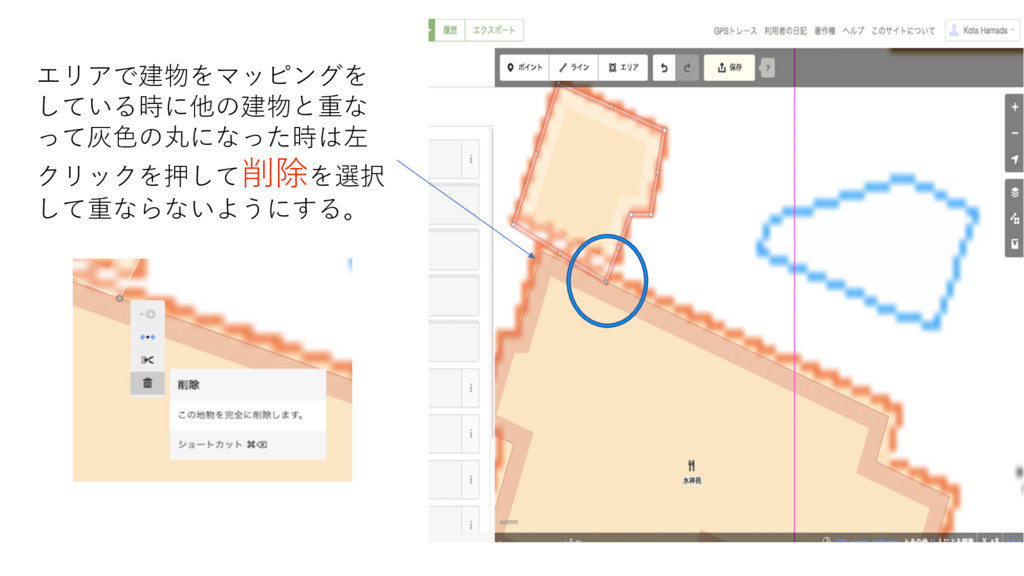 エリアで建物をマッピングを している時に他の建物と重な って灰⾊の丸になった時は左 クリックを押して削除を選択 して重ならないようにする。
