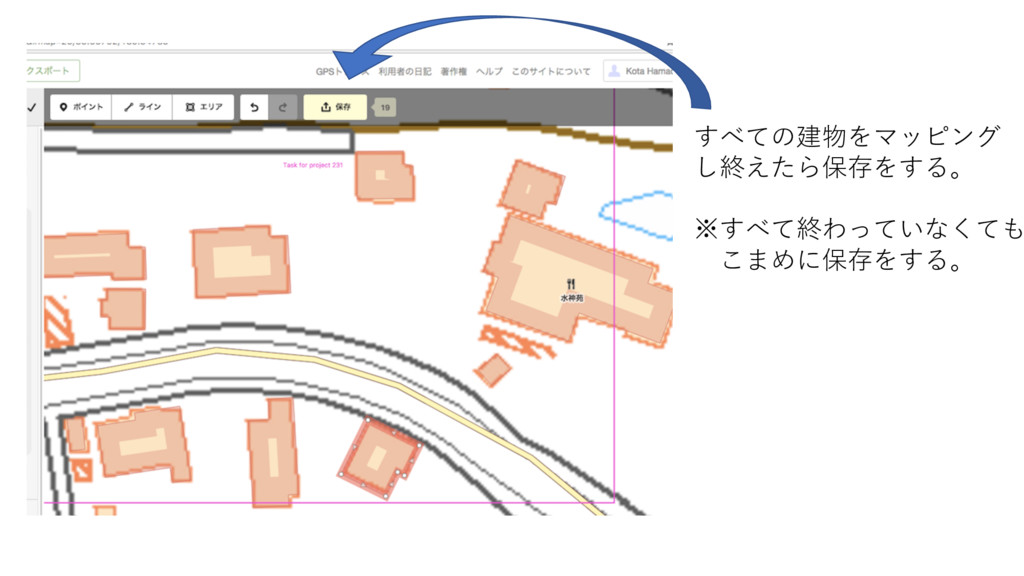 すべての建物をマッピング し終えたら保存をする。 ※すべて終わっていなくても こまめに保存をする。