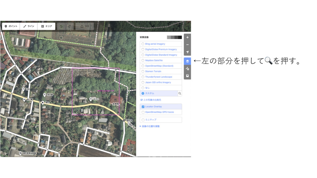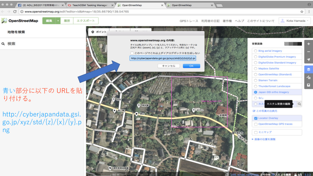 ⻘い部分に以下の URLを貼 り付ける。 http://cyberjapandata.gsi. go.jp/xyz/std/{z}/{x}/{y}.p ng