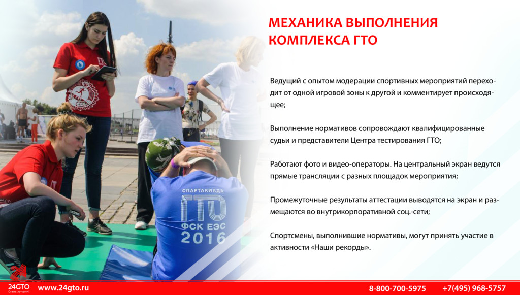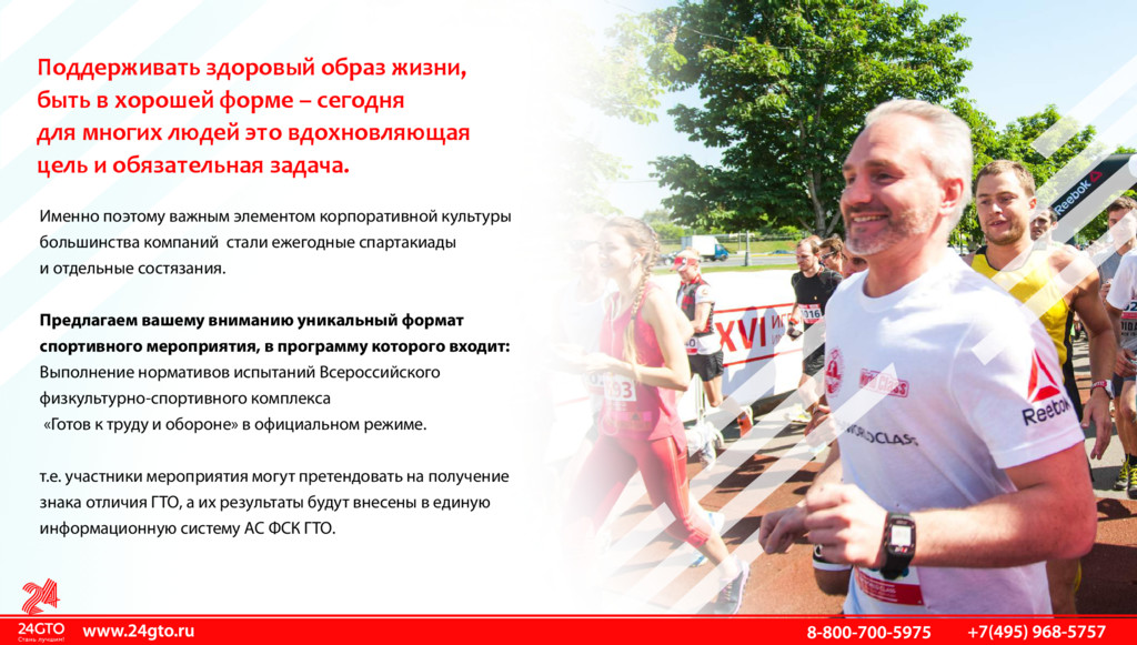 для многих людей это вдохновляющая цель и обязательная задача. Именно поэтому важным элементом корпоративной культуры большинства компаний стали ежегодные спартакиады и отдельные состязания. Предлагаем вашему вниманию уникальный формат спортивного мероприятия, в программу которого входит: Выполнение нормативов испытаний Всероссийского физкультурно-спортивного комплекса «Готов к труду и обороне» в официальном режиме. т.е. участники мероприятия могут претендовать на получение знака отличия ГТО, а их результаты будут внесены в единую информационную систему АС ФСК ГТО.