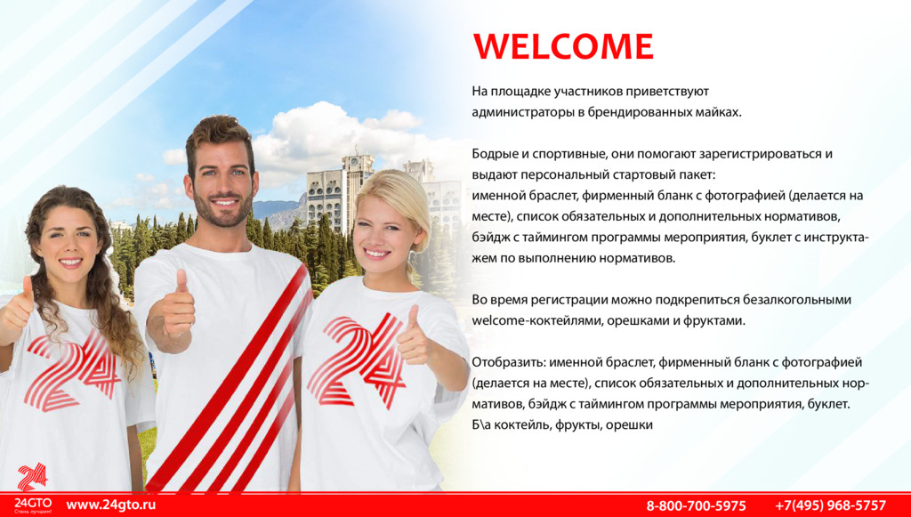 спортивные, они помогают зарегистрироваться и выдают персональный стартовый пакет: именной браслет, фирменный бланк с фотографией (делается на месте), список обязательных и дополнительных нормативов, бэйдж с таймингом программы мероприятия, буклет с инструкта- жем по выполнению нормативов. Во время регистрации можно подкрепиться безалкогольными welcome-коктейлями, орешками и фруктами. Отобразить: именной браслет, фирменный бланк с фотографией (делается на месте), список обязательных и дополнительных нор- мативов, бэйдж с таймингом программы мероприятия, буклет. Б\а коктейль, фрукты, орешки WELCOME