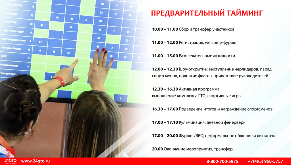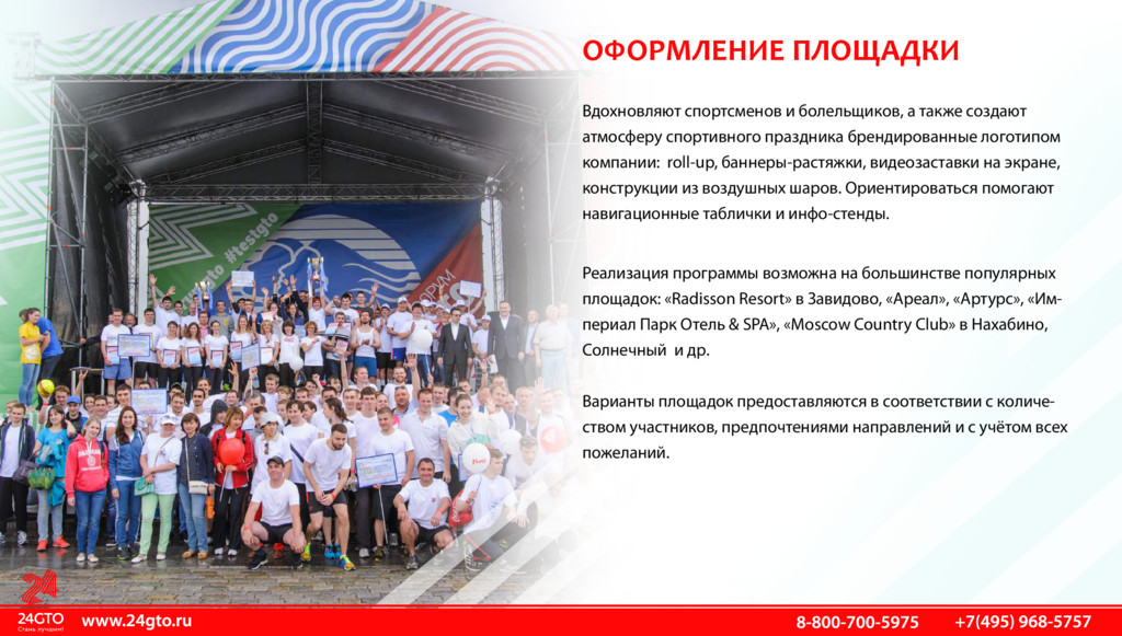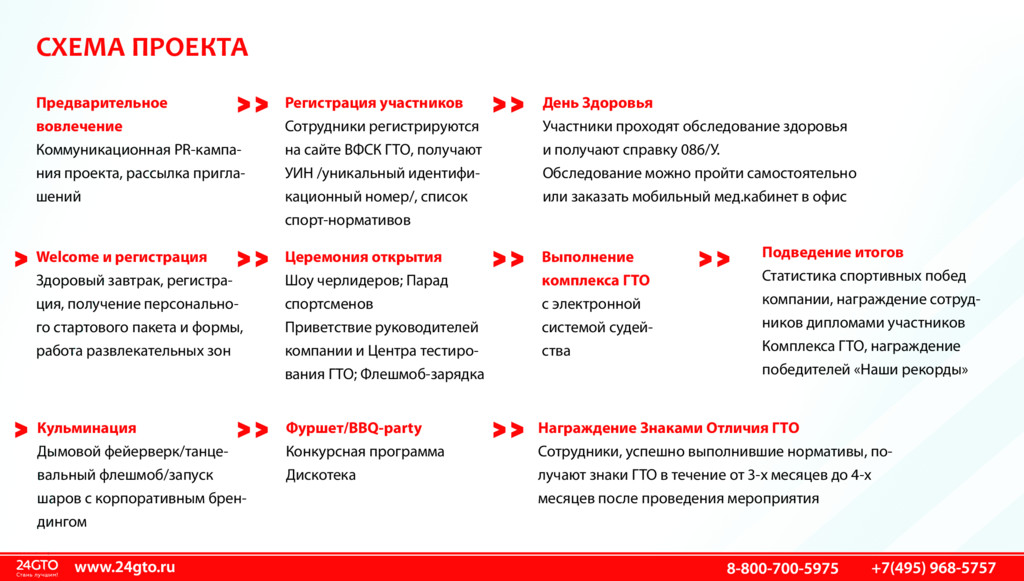 и регистрация Здоровый завтрак, регистра- ция, получение персонально- го стартового пакета и формы, работа развлекательных зон Подведение итогов Статистика спортивных побед компании, награждение сотруд- ников дипломами участников Комплекса ГТО, награждение победителей «Наши рекорды» Кульминация Дымовой фейерверк/танце- вальный флешмоб/запуск шаров с корпоративным брен- дингом Фуршет/BBQ-party Конкурсная программа Дискотека Выполнение комплекса ГТО с электронной системой судей- ства Церемония открытия Шоу черлидеров; Парад спортсменов Приветствие руководителей компании и Центра тестиро- вания ГТО; Флешмоб-зарядка Награждение Знаками Отличия ГТО Сотрудники, успешно выполнившие нормативы, по- лучают знаки ГТО в течение от 3-х месяцев до 4-х месяцев после проведения мероприятия День Здоровья Участники проходят обследование здоровья и получают справку 086/У. Обследование можно пройти самостоятельно или заказать мобильный мед.кабинет в офис Регистрация участников Сотрудники регистрируются на сайте ВФСК ГТО, получают УИН /уникальный идентифи- кационный номер/, список спорт-нормативов СХЕМА ПРОЕКТА