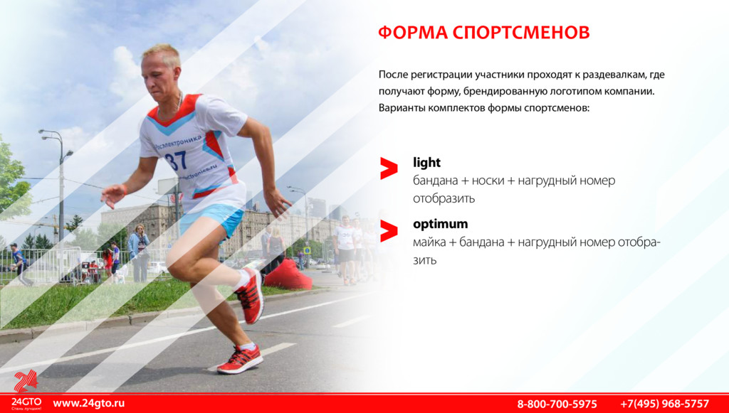 логотипом компании. Варианты комплектов формы спортсменов: light бандана + носки + нагрудный номер отобразить optimum майка + бандана + нагрудный номер отобра- зить ФОРМА СПОРТСМЕНОВ