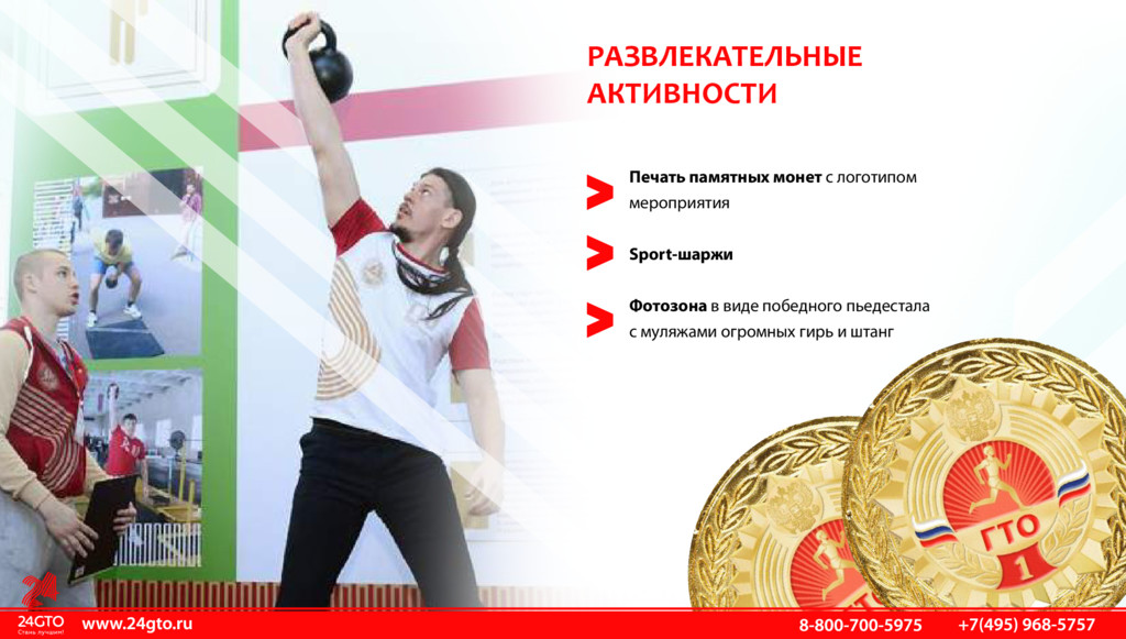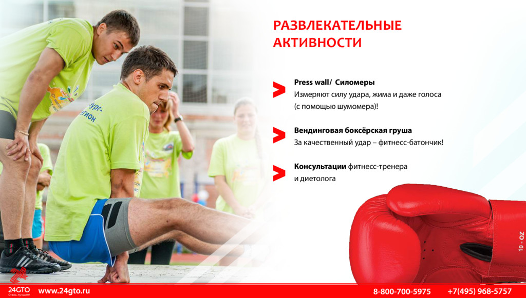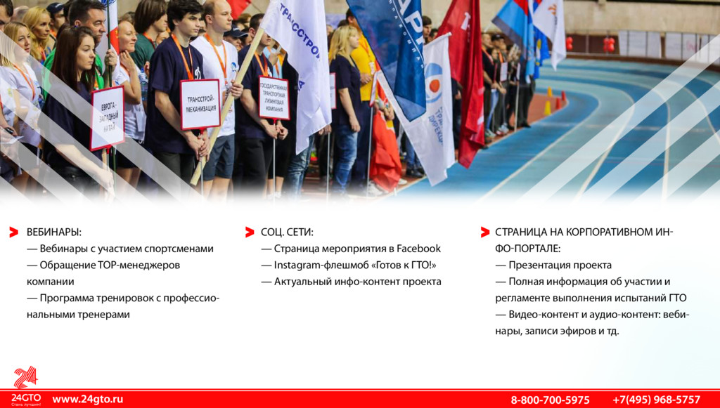 — Программа тренировок с профессио- нальными тренерами СОЦ. СЕТИ: — Страница мероприятия в Facebook — Instagram-флешмоб «Готов к ГТО!» — Актуальный инфо-контент проекта СТРАНИЦА НА КОРПОРАТИВНОМ ИН ФО ПОРТАЛЕ: — Презентация проекта — Полная информация об участии и регламенте выполнения испытаний ГТО — Видео-контент и аудио-контент: веби- нары, записи эфиров и тд.