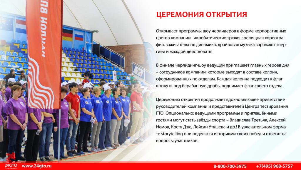 трюки, зрелищная хореогра- фия, зажигательная динамика, драйвовая музыка заряжают энер- гией и жаждой действовать! В финале черлидинг-шоу ведущий приглашает главных героев дня – сотрудников компании, которые выходят в составе колонн, сформированных по отделам. Каждая колонна подходит к флаг- штоку и, под барабанную дробь, поднимает флаг своего отдела. Церемонию открытия продолжает вдохновляющее приветствие руководителей компании и представителей Центра тестирования ГТО! Опционально: ведущими программы и приглашёнными гостями могут стать звёзды спорта – Владислав Третьяк, Алексей Немов, Костя Дзю, Лейсан Утяшева и др.! В увлекательном форма- те storytelling они поделятся историями своих побед и ответят на вопросы участников. ЦЕРЕМОНИЯ ОТКРЫТИЯ