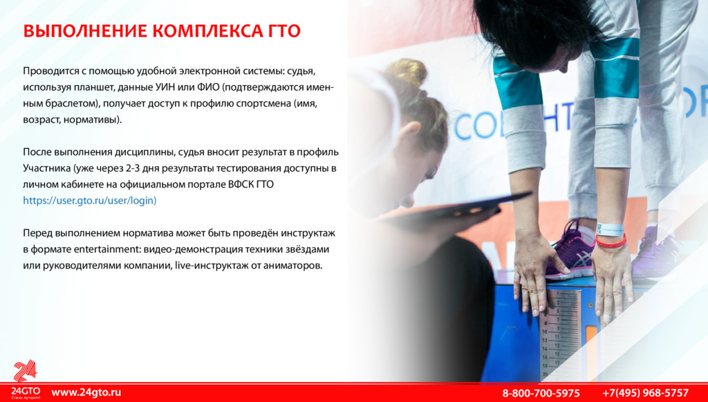 УИН или ФИО (подтверждаются имен- ным браслетом), получает доступ к профилю спортсмена (имя, возраст, нормативы). После выполнения дисциплины, судья вносит результат в профиль Участника (уже через 2-3 дня результаты тестирования доступны в личном кабинете на официальном портале ВФСК ГТО https://user.gto.ru/user/login) Перед выполнением норматива может быть проведён инструктаж в формате entertainment: видео-демонстрация техники звёздами или руководителями компании, live-инструктаж от аниматоров. ВЫПОЛНЕНИЕ КОМПЛЕКСА ГТО