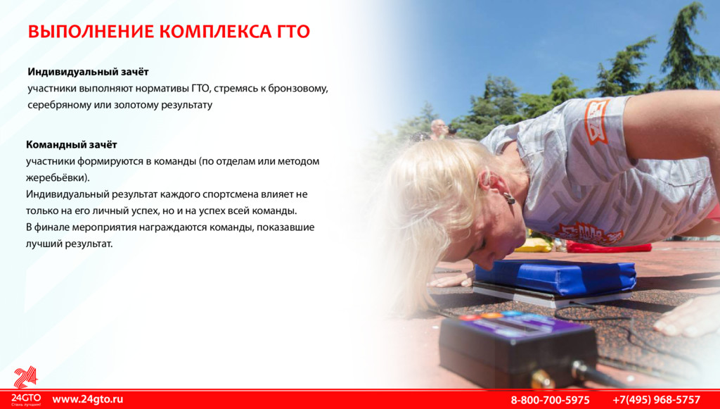 или золотому результату Командный зачёт участники формируются в команды (по отделам или методом жеребьёвки). Индивидуальный результат каждого спортсмена влияет не только на его личный успех, но и на успех всей команды. В финале мероприятия награждаются команды, показавшие лучший результат. ВЫПОЛНЕНИЕ КОМПЛЕКСА ГТО