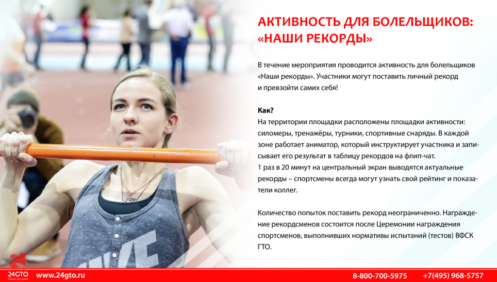 могут поставить личный рекорд и превзойти самих себя! Как? На территории площадки расположены площадки активности: силомеры, тренажёры, турники, спортивные снаряды. В каждой зоне работает аниматор, который инструктирует участника и запи- сывает его результат в таблицу рекордов на флип-чат. 1 раз в 20 минут на центральный экран выводятся актуальные рекорды – спортсмены всегда могут узнать свой рейтинг и показа- тели коллег. Количество попыток поставить рекорд неограниченно. Награжде- ние рекордсменов состоится после Церемонии награждения спортсменов, выполнивших нормативы испытаний (тестов) ВФСК ГТО. АКТИВНОСТЬ ДЛЯ БОЛЕЛЬЩИКОВ: «НАШИ РЕКОРДЫ»