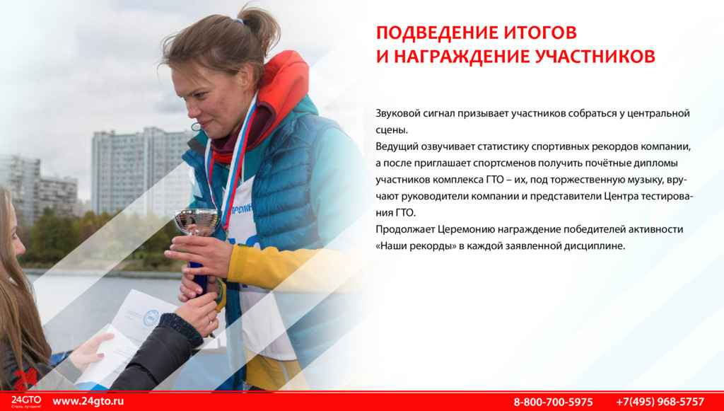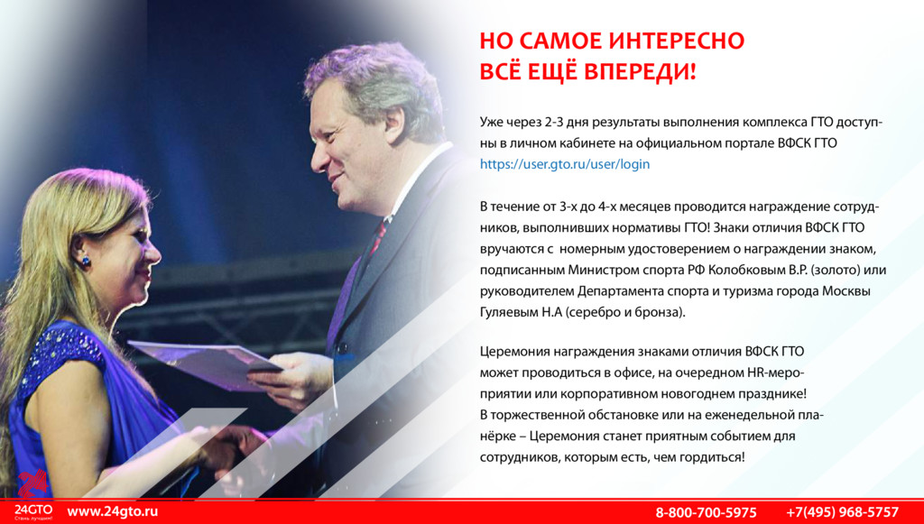 в личном кабинете на официальном портале ВФСК ГТО https://user.gto.ru/user/login В течение от 3-х до 4-х месяцев проводится награждение сотруд- ников, выполнивших нормативы ГТО! Знаки отличия ВФСК ГТО вручаются с номерным удостоверением о награждении знаком, подписанным Министром спорта РФ Колобковым В.Р. (золото) или руководителем Департамента спорта и туризма города Москвы Гуляевым Н.А (серебро и бронза). Церемония награждения знаками отличия ВФСК ГТО может проводиться в офисе, на очередном HR-меро- приятии или корпоративном новогоднем празднике! В торжественной обстановке или на еженедельной пла- нёрке – Церемония станет приятным событием для сотрудников, которым есть, чем гордиться! НО САМОЕ ИНТЕРЕСНО ВСЁ ЕЩЁ ВПЕРЕДИ!