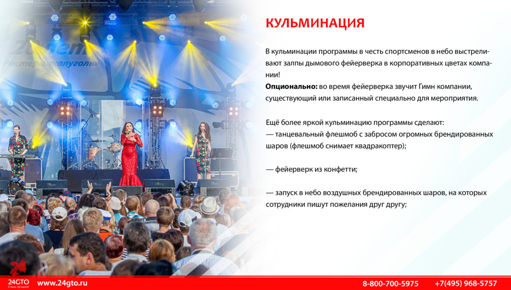 залпы дымового фейерверка в корпоративных цветах компа- нии! Опционально: во время фейерверка звучит Гимн компании, существующий или записанный специально для мероприятия. Ещё более яркой кульминацию программы сделают: — танцевальный флешмоб с забросом огромных брендированных шаров (флешмоб снимает квадракоптер); — фейерверк из конфетти; — запуск в небо воздушных брендированных шаров, на которых сотрудники пишут пожелания друг другу; КУЛЬМИНАЦИЯ