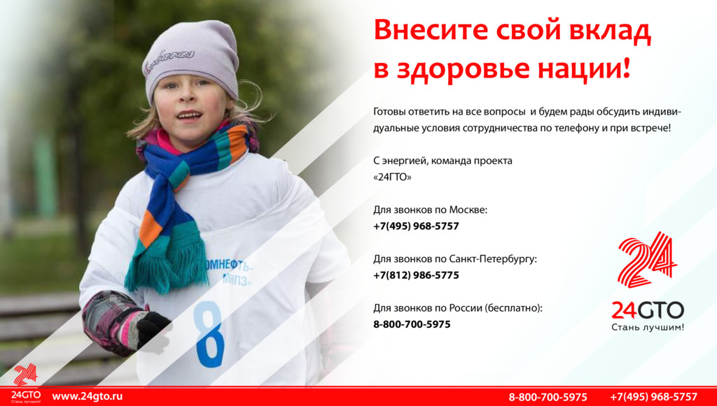 дуальные условия сотрудничества по телефону и при встрече! С энергией, команда проекта «24ГТО» Для звонков по Москве: +7(495) 968-5757 Для звонков по Санкт-Петербургу: +7(812) 986-5775 Для звонков по России (бесплатно): 8-800-700-5975 Внесите свой вклад в здоровье нации!