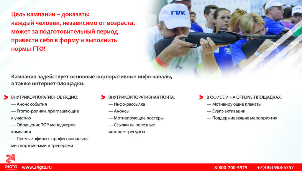 — Обращение TOP-менеджеров компании — Прямые эфиры с профессиональны- ми спортсменами и тренерами ВНУТРИКОРПОРАТИВНАЯ ПОЧТА: — Инфо-рассылка — Анонсы — Мотивирующие постеры — Ссылки на полезные интернет-ресурсы В ОФИСЕ И НА OFFLINE ПЛОЩАДКАХ: — Мотивирующие плакаты — Event-активации — Поддерживающие мероприятия Цель кампании – доказать: каждый человек, независимо от возраста, может за подготовительный период привести себя в форму и выполнить нормы ГТО! Кампания задействует основные корпоративные инфо-каналы, а также интернет-площадки.