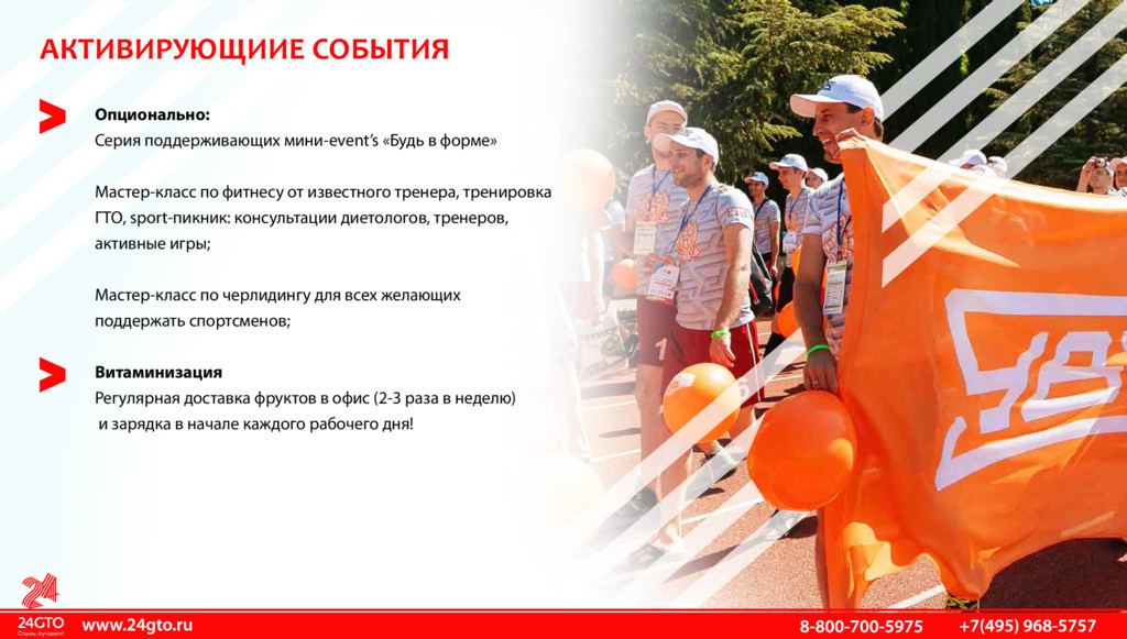 по фитнесу от известного тренера, тренировка ГТО, sport-пикник: консультации диетологов, тренеров, активные игры; Мастер-класс по черлидингу для всех желающих поддержать спортсменов; Витаминизация Регулярная доставка фруктов в офис (2-3 раза в неделю) и зарядка в начале каждого рабочего дня!