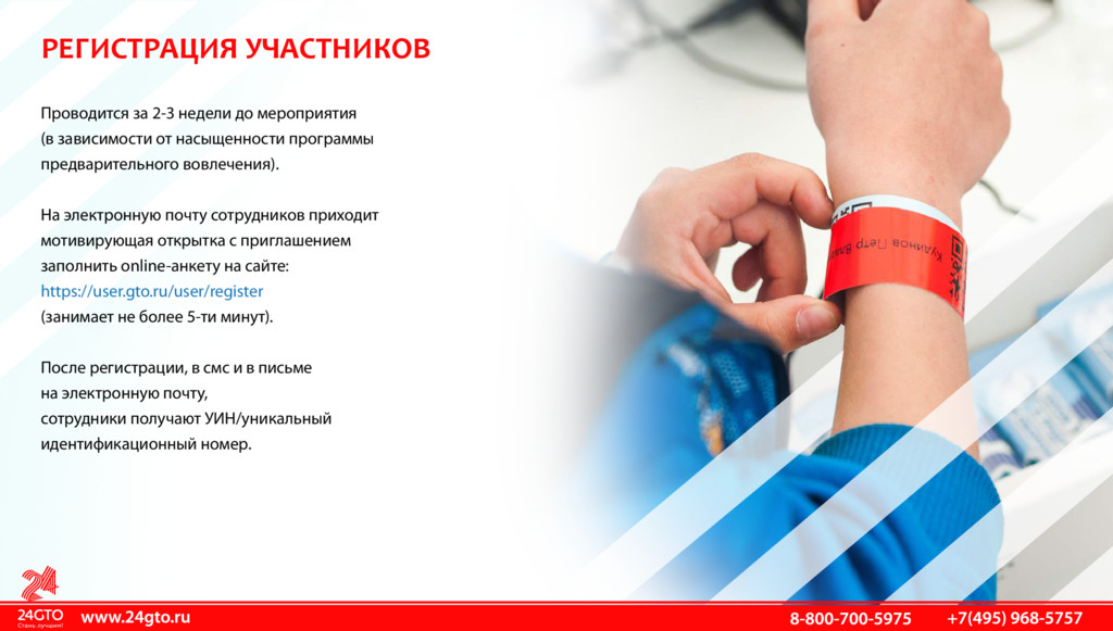 от насыщенности программы предварительного вовлечения). На электронную почту сотрудников приходит мотивирующая открытка с приглашением заполнить online-анкету на сайте: https://user.gto.ru/user/register (занимает не более 5-ти минут). После регистрации, в смс и в письме на электронную почту, сотрудники получают УИН/уникальный идентификационный номер.