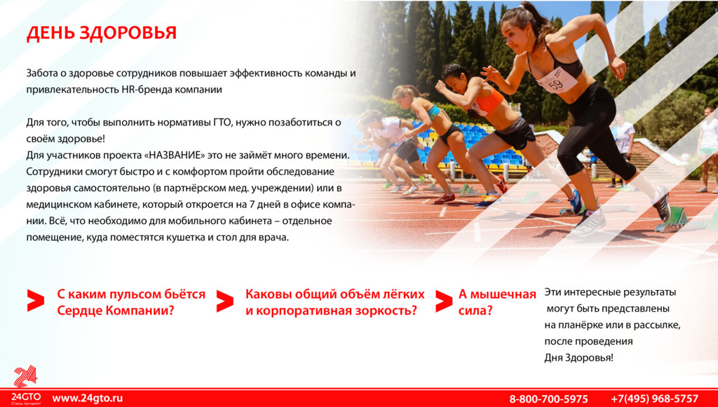 компании Для того, чтобы выполнить нормативы ГТО, нужно позаботиться о своём здоровье! Для участников проекта «НАЗВАНИЕ» это не займёт много времени. Сотрудники смогут быстро и с комфортом пройти обследование здоровья самостоятельно (в партнёрском мед. учреждении) или в медицинском кабинете, который откроется на 7 дней в офисе компа- нии. Всё, что необходимо для мобильного кабинета – отдельное помещение, куда поместятся кушетка и стол для врача. ДЕНЬ ЗДОРОВЬЯ С каким пульсом бьётся Сердце Компании? Каковы общий объём лёгких и корпоративная зоркость? А мышечная сила? Эти интересные результаты могут быть представлены на планёрке или в рассылке, после проведения Дня Здоровья!