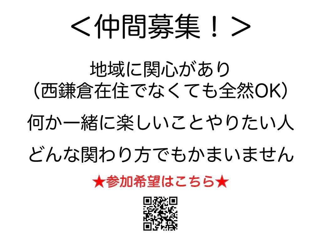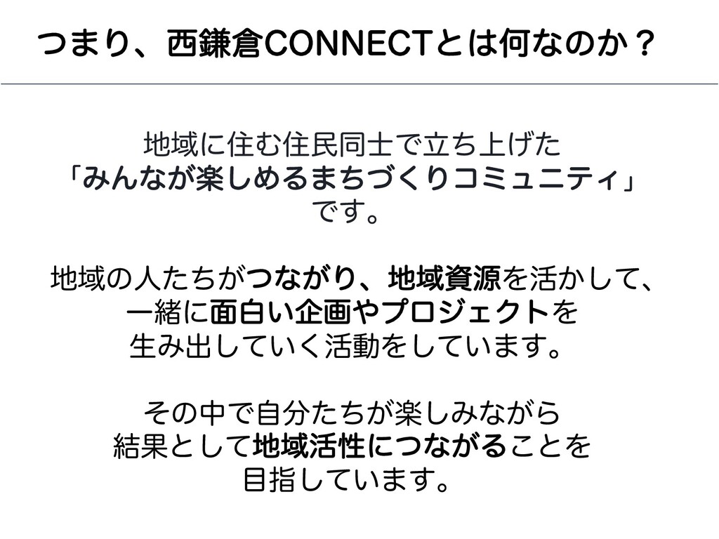 西鎌倉CONNECTとは? 地域に住む住民同士で立ち上げた「みんなが楽しめるまちづくりコミュニティ」です。 地域の人たちがつながり、地域資源を活かして、一緒に面白い企画やプロジェクトを生み出していく活動をしています。その中で自分たちが楽しみながら結果として地域活性につながることを目指しています。