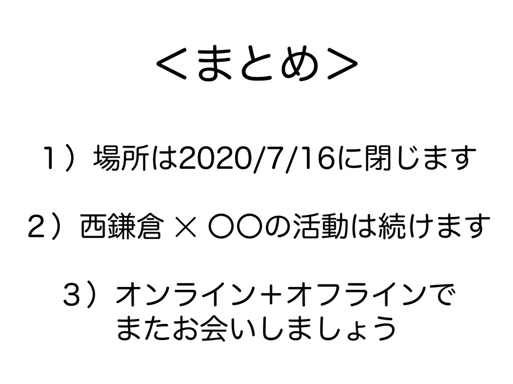 2019年7月にスタートした西鎌倉CONNECTの1周年とクロージングパーティーのスライドとなります。