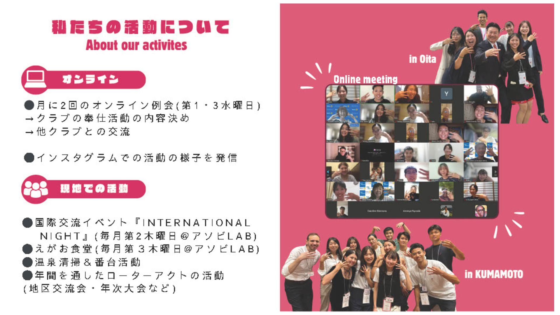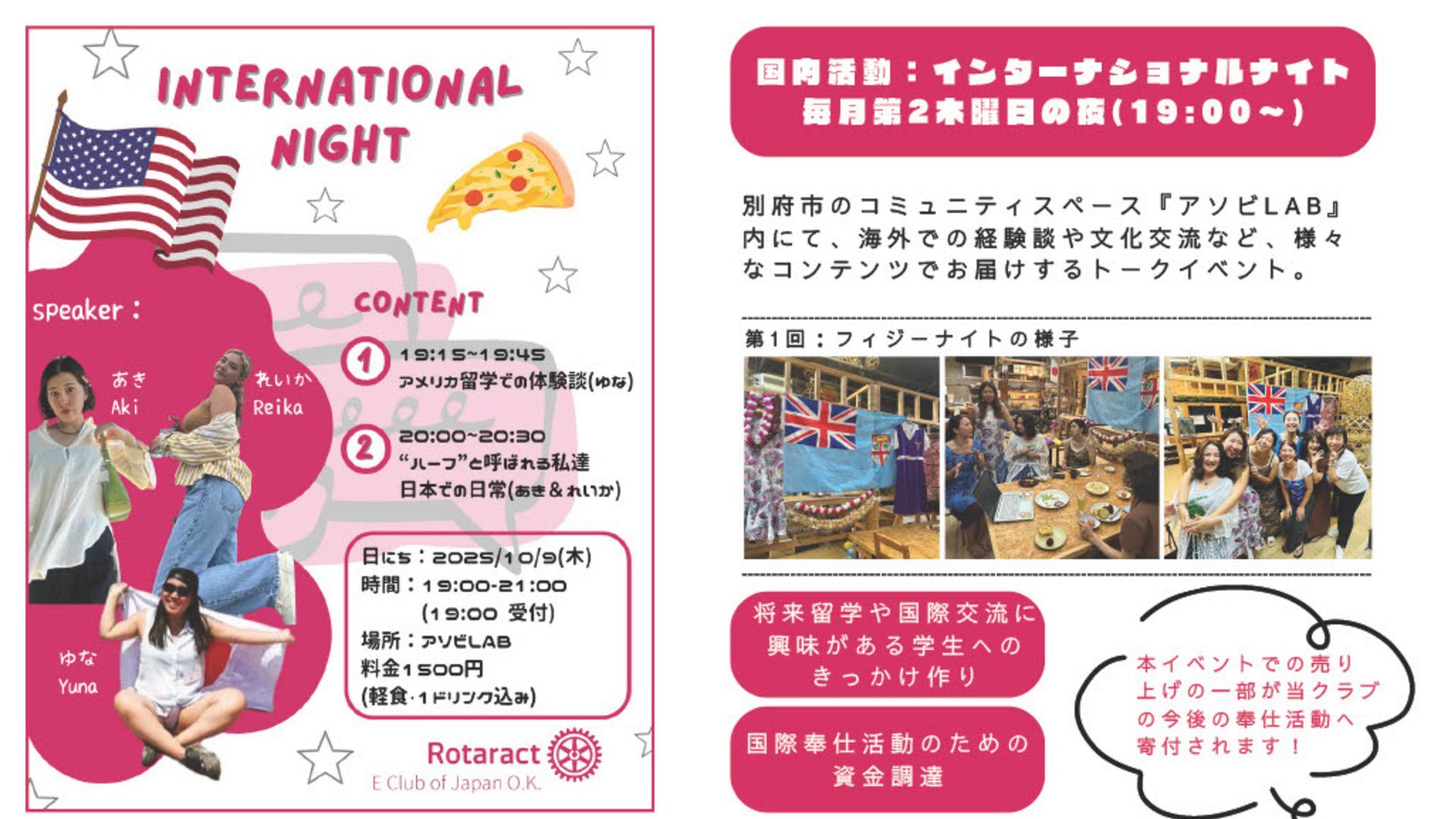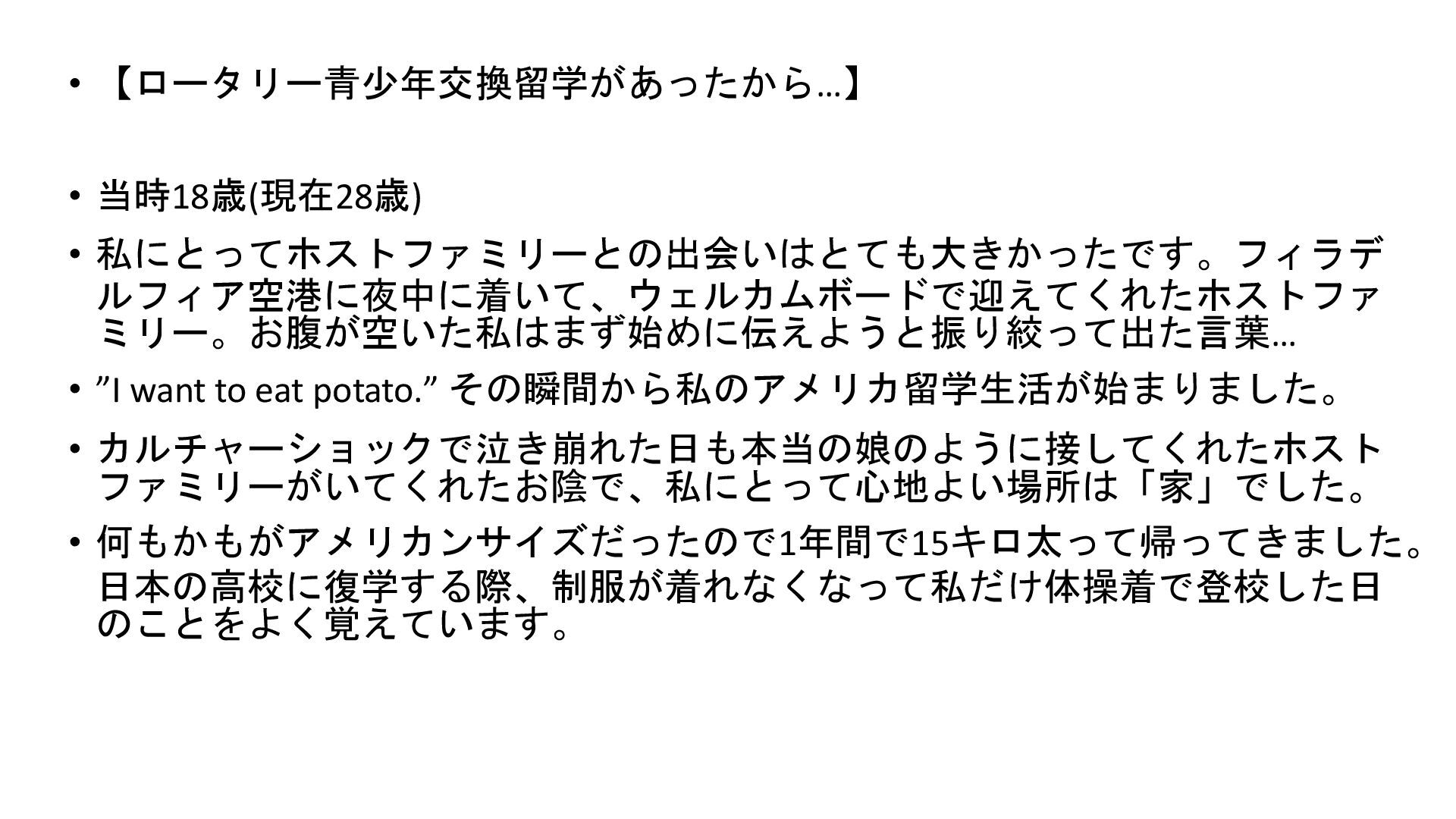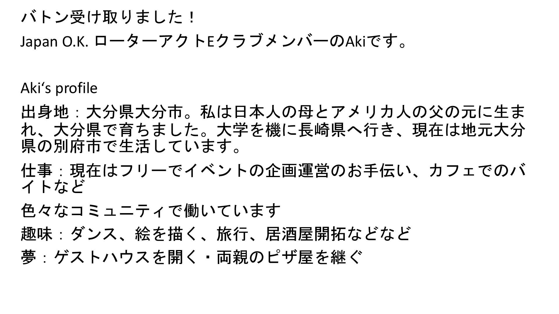 2720 Japan O.K. ロータリーEクラブ、2025年12月1日卓話として、Japan O.K. ローターアクトEクラブ 会長 川端 柚菜 氏に、『ローターアクトEクラブ アメリカンナイト』でのお話で使用されていたをスライドにて提供いたします。