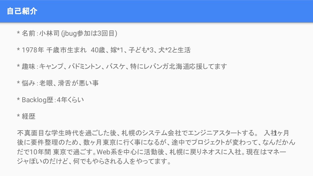 自己紹介 * 名前:小林司 (jbug参加は3回目) * 1978年 千歳市生まれ 40歳、嫁*1、子ども*3、犬*2と生活 * 趣味:キャンプ、バドミントン、バスケ、特にレバンガ北海道 応援してます