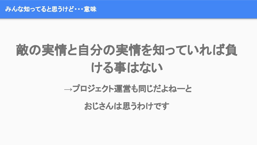 みんな知ってると思うけど・・・意味 敵の実情と自分の実情を知っていれば負 ける事はない →プロジェクト運営も同じだよねーと おじさんは思うわけです