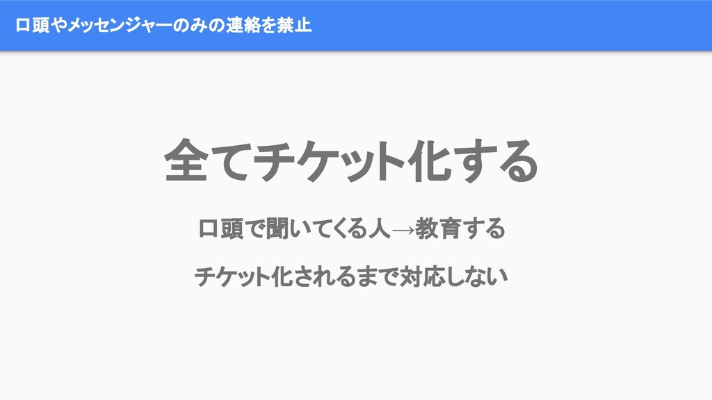 口頭やメッセンジャーのみの連絡を禁止 全てチケット化する 口頭で聞いてくる人→教育する チケット化されるまで対応しない