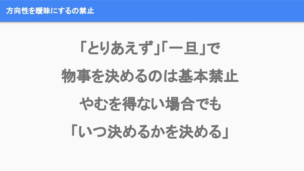 方向性を曖昧にするの禁止 「とりあえず」「一旦」で 物事を決めるのは基本禁止 やむを得ない場合でも 「いつ決めるかを決める」