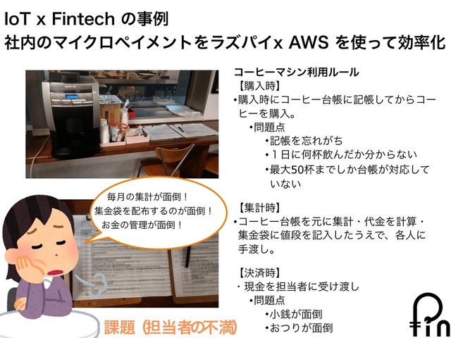 x Fintech ͷϙΠϯτ •ۚ༥ʹ͞ΕͨʮσʔλԽ͞Ε͍ͯͳ͍ແͷݱʯͱʁ •ʮগֹݸਓܾؒࡁʯͰͳ͍͔ʁͱ͍͏ͷ͕ࠓճͷؾ͖ͮ •গֹΏ͑ɺखྉγεςϜίετ͍͜ͱ͕ඞਢ݅ •ϥζύΠαʔόϨε͏͚ͬͯͭͳٕज़ ͬͯΈͯײͨ͡ʮIoT x Fintechʯͷצॴ