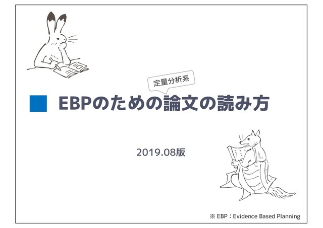 定量的な分析を主体とする論文 p ここでの「定量的な分析」は,統計的検定を想定 • 数学的な何らかの証明や,質的観点のみのケーススタディ, 哲学的な論考,などの論文は含まない • EBM※関連の論文や,実験心理学系の論文,などを想定 2 ※ EBM:Evidence Based Medicine ← 正確性よりわかりやすさ重視