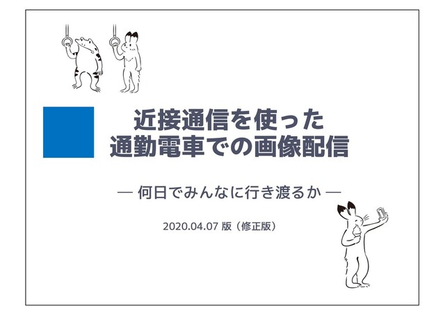 通勤ラッシュでものすごい過密時間があったり,なかったりで日数に差はある? n やりかた u モンテカルロシミュレーション n わかったこと u オフピーク出勤されると,画像の配信に時間がかかる… p ただし,「今日は早め,明日は遅め」など,みんな適当に出勤時間を決めると, むしろ,あっという間に画像を配信することが可能に p わずか 0.1% の人が適当に動くだけでも,オフピークの効果をかなり軽減可能 2 CoVID-19 早く収まると良いですね J