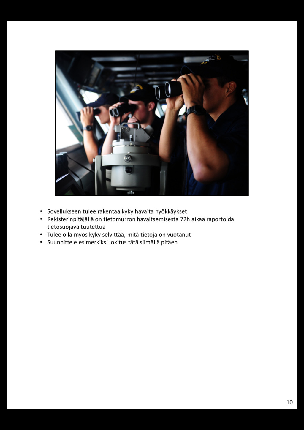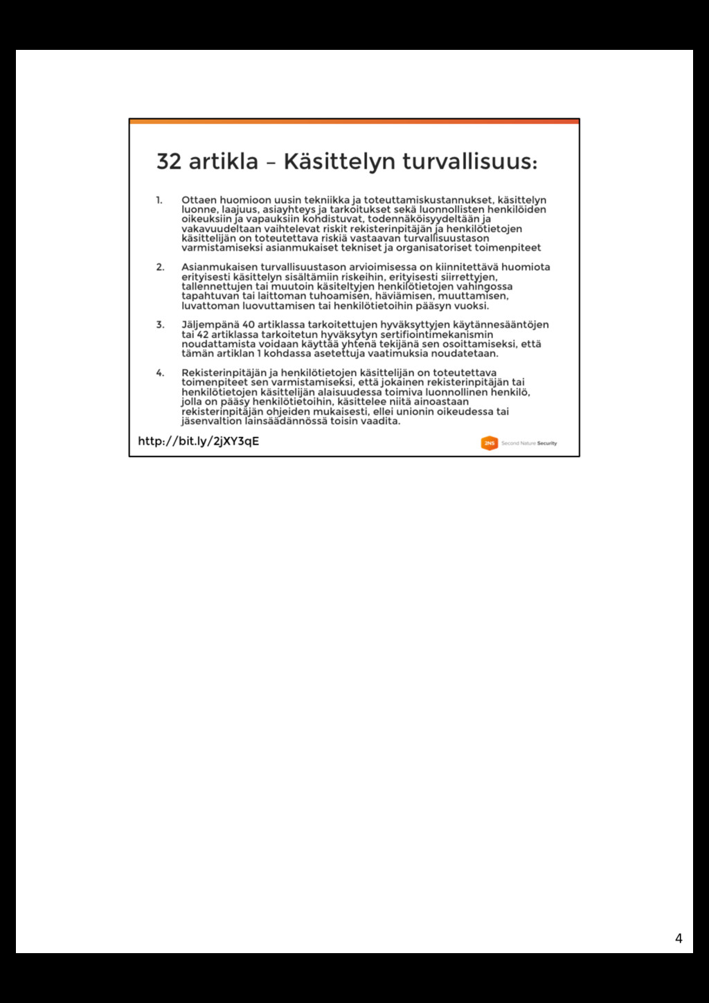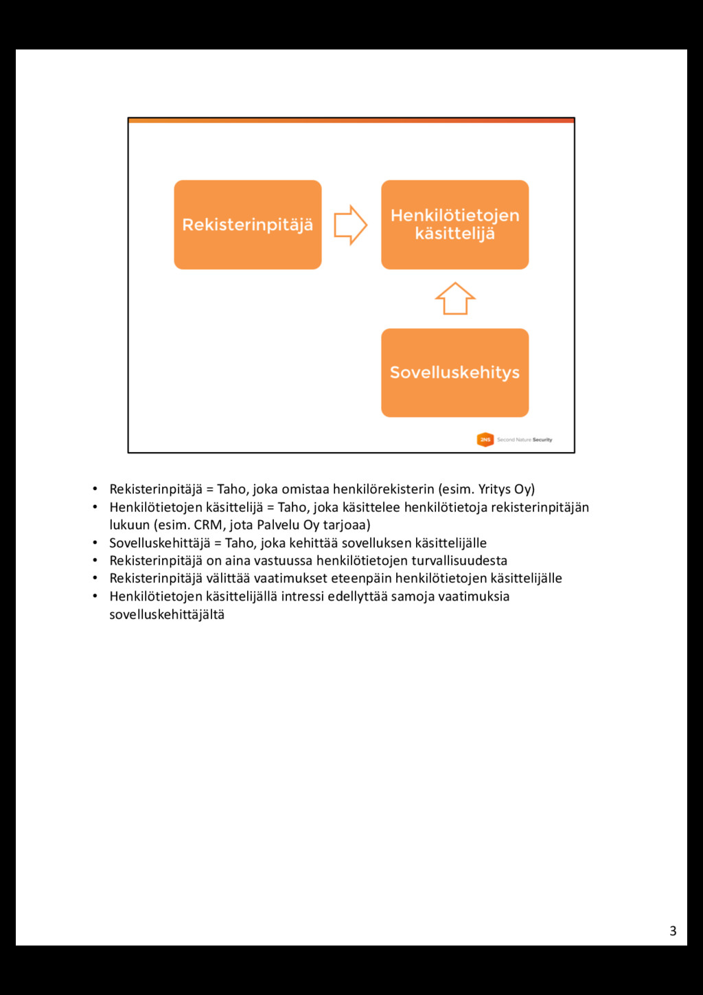 • Henkilötietojen käsittelijä = Taho, joka käsittelee henkilötietoja rekisterinpitäjän lukuun (esim. CRM, jota Palvelu Oy tarjoaa) • Sovelluskehittäjä = Taho, joka kehittää sovelluksen käsittelijälle • Rekisterinpitäjä on aina vastuussa henkilötietojen turvallisuudesta • Rekisterinpitäjä välittää vaatimukset eteenpäin henkilötietojen käsittelijälle • Henkilötietojen käsittelijällä intressi edellyttää samoja vaatimuksia sovelluskehittäjältä 3
