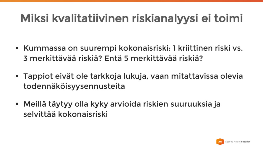 Riskistä harvoin voidaan todeta tarkkaa rahallista tappiota – Voidaan kuitenkin pyrkiä ennustamaan väli, johon 90% kerroista tappio osuu § Riskit noudattavat usein tiettyä jakaumaa § Näiden tietojen avulla riskien jakaumaa voidaan mitata esim. Monte Carlo simulaatiolla