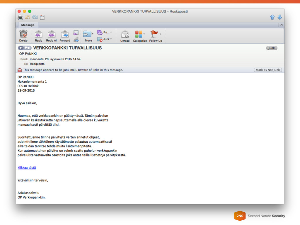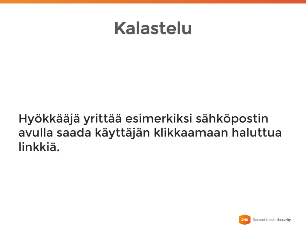 Kalastelu Hyökkääjä yrittää esimerkiksi sähköpostin avulla saada käyttäjän klikkaamaan haluttua