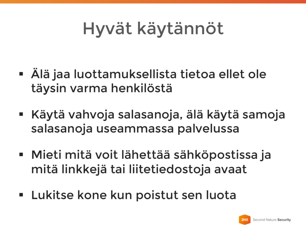 varma henkilöstä § Käytä vahvoja salasanoja, älä käytä samoja salasanoja useammassa palvelussa § Mieti mitä voit lähettää sähköpostissa ja mitä linkkejä tai liitetiedostoja avaat § Lukitse kone kun poistut sen luota