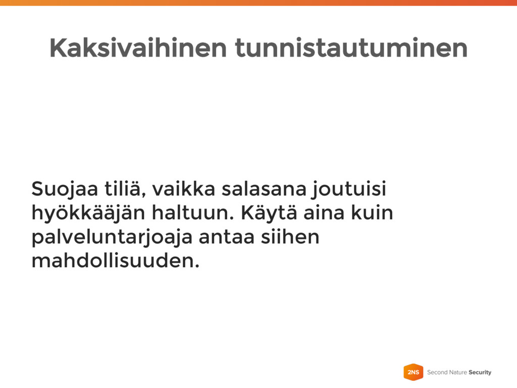 Kaksivaihinen tunnistautuminen Suojaa tiliä, vaikka salasana joutuisi hyökkääjän haltuun. Käytä