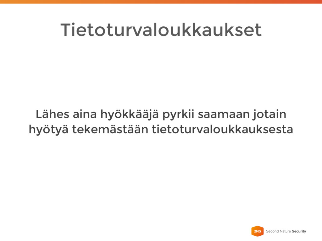 Tietoturvaloukkaukset Lähes aina hyökkääjä pyrkii saamaan jotain hyötyä tekemästään tietoturvaloukkauksesta