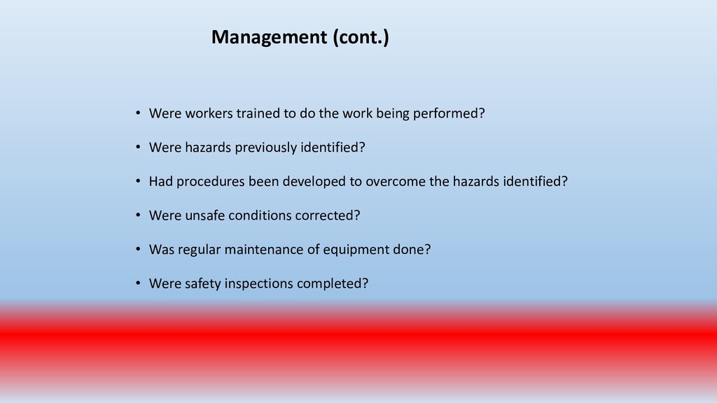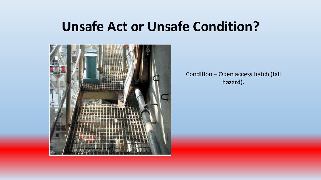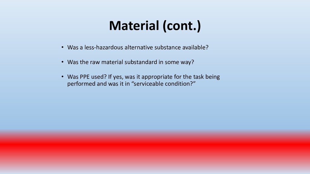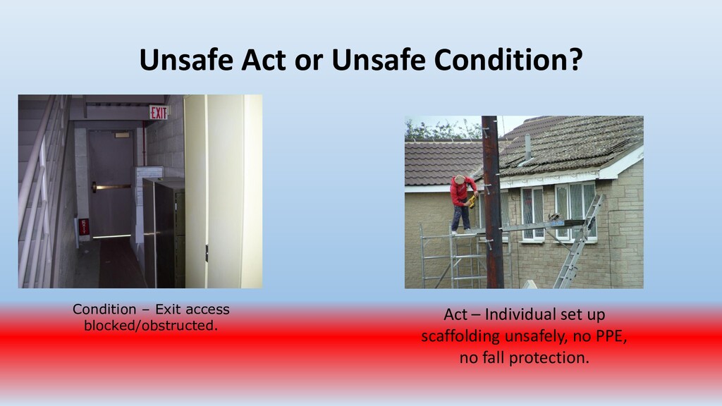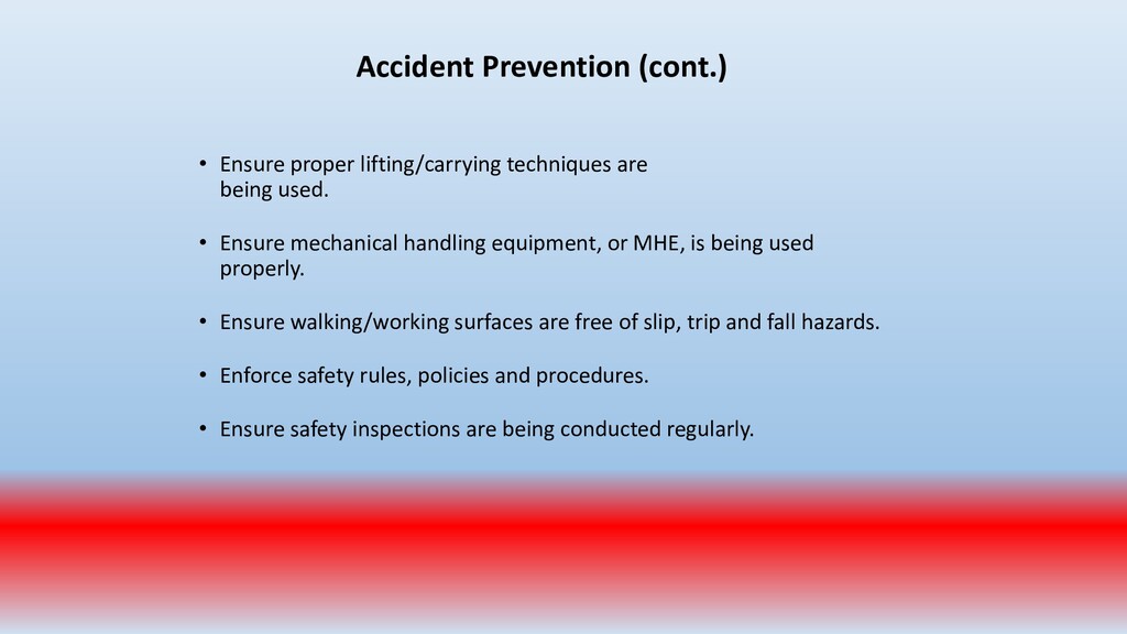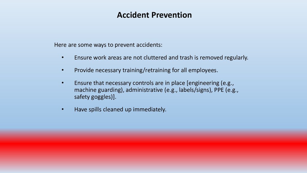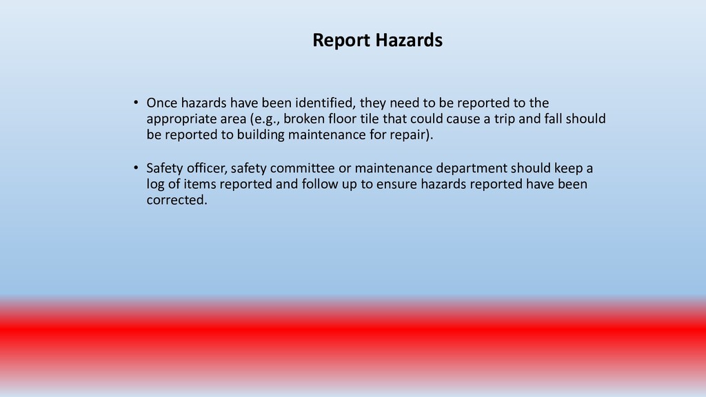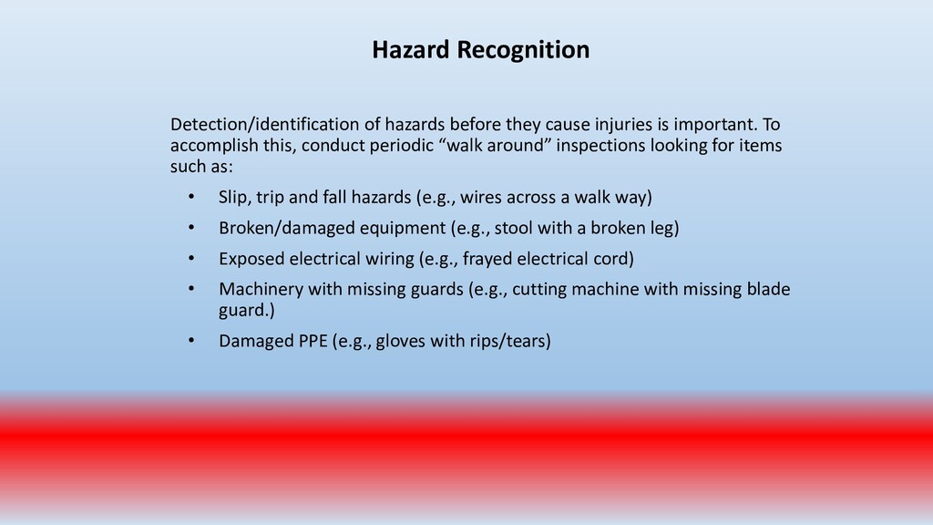 important. To accomplish this, conduct periodic “walk around” inspections looking for items such as: • Slip, trip and fall hazards (e.g., wires across a walk way) • Broken/damaged equipment (e.g., stool with a broken leg) • Exposed electrical wiring (e.g., frayed electrical cord) • Machinery with missing guards (e.g., cutting machine with missing blade guard.) • Damaged PPE (e.g., gloves with rips/tears)