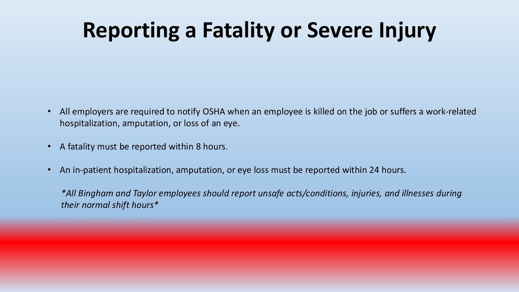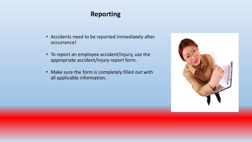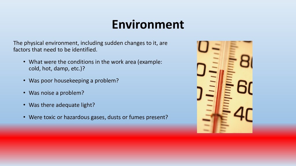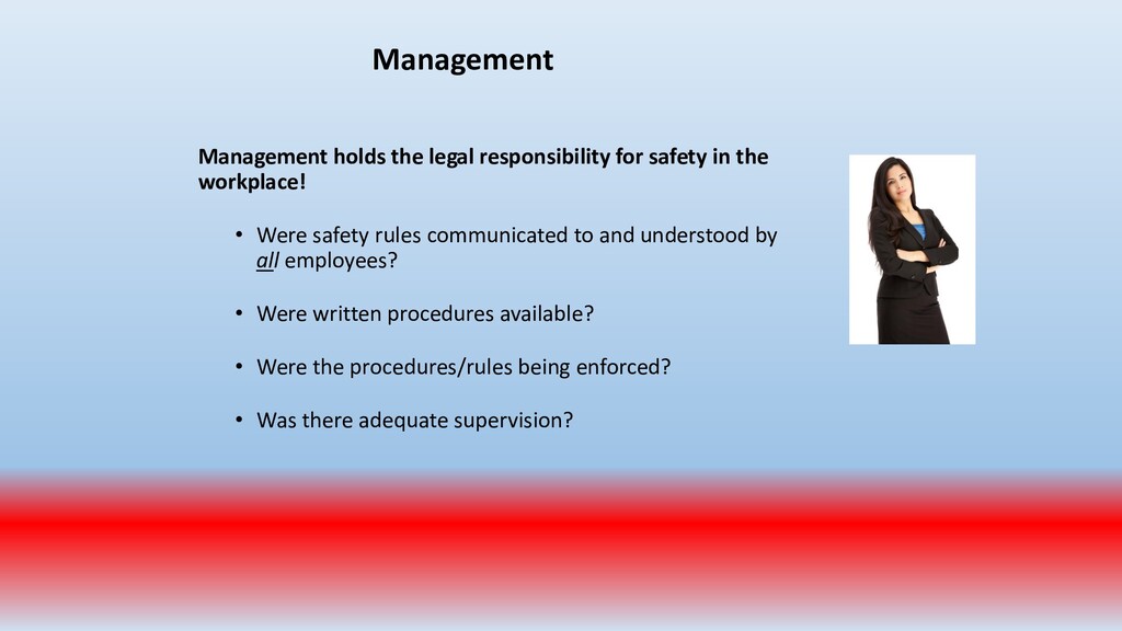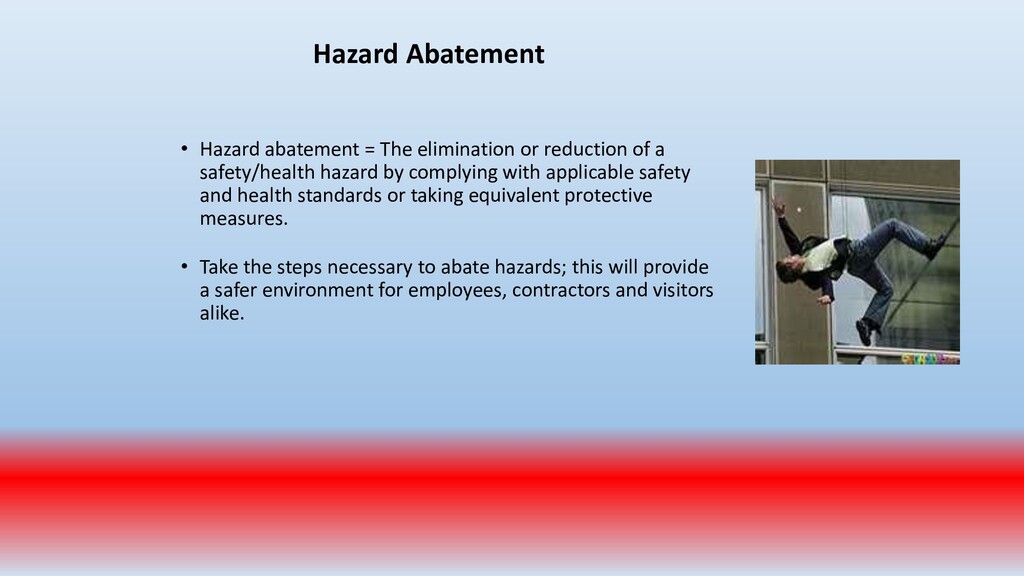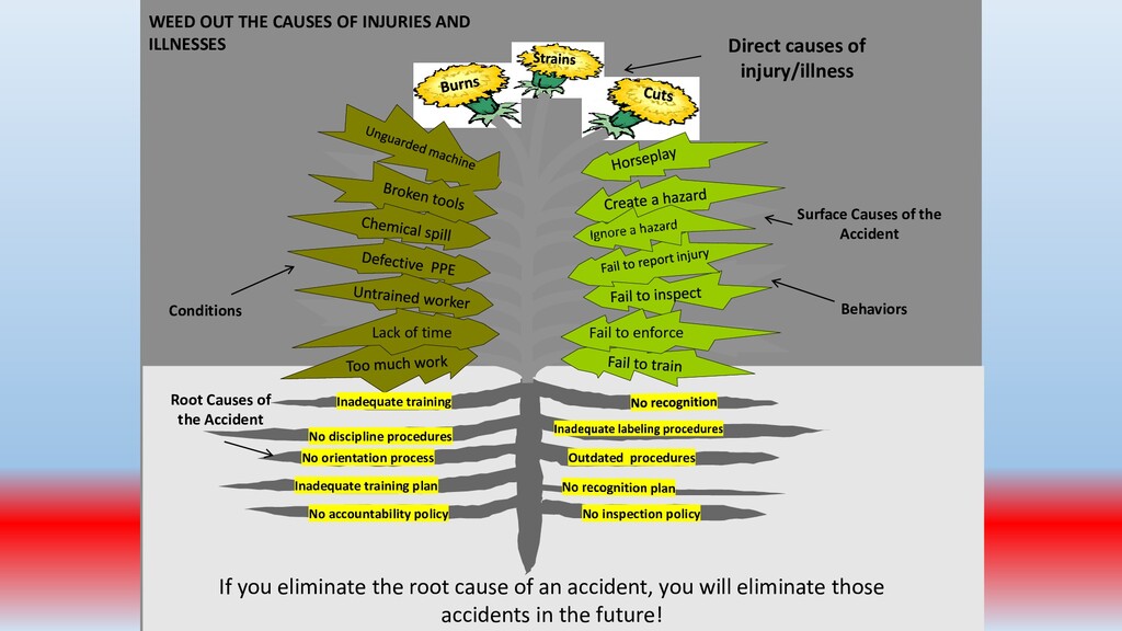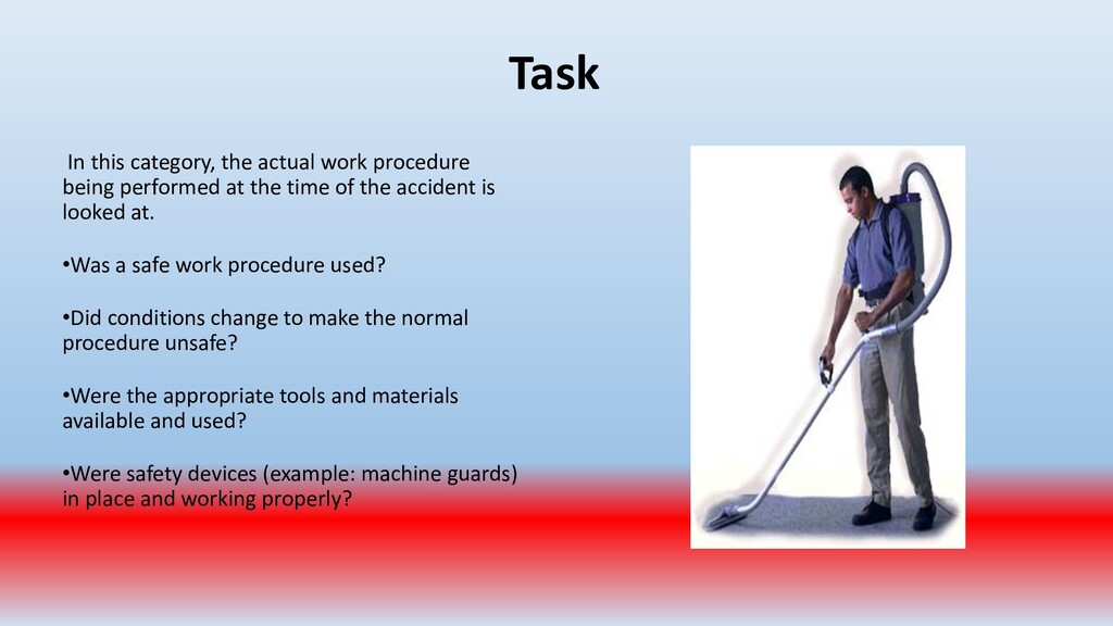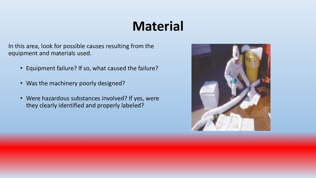 important. To accomplish this, conduct periodic “walk around” inspections looking for items such as: • Slip, trip and fall hazards (e.g., wires across a walk way) • Broken/damaged equipment (e.g., stool with a broken leg) • Exposed electrical wiring (e.g., frayed electrical cord) • Machinery with missing guards (e.g., cutting machine with missing blade guard.) • Damaged PPE (e.g., gloves with rips/tears)