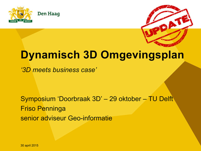 lopende trajecten: • pilot Binckhorst (korte termijn, klein gebied) • project Dynamisch 3D model (langere termijn, stad) Ambitieniveaus: • Niveau 0: een platte plankaart getoetst met bestaande modelinfrastructuur • Niveau 1: een 3D plankaart getoetst met bestaande modelinfrastructuur • Niveau 2: een 3D plankaart getoetst met een centraal uniform gegevensbestand • Niveau 3: een 3D plankaart met dynamisch 3D model