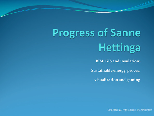 Haag on insulation, GIS and BIM Cooperation on sustainable energy planning Demo by Sanne Infrastructure by Steven Fruijtier – Geodan Cooperation on serious gaming and energy planning Game interface by Steven Fruijtier – Geodan Game dynamics by Sanne Future research topics Plan compiling from Minecraft results Perceived added value of 3D in flood crisis management