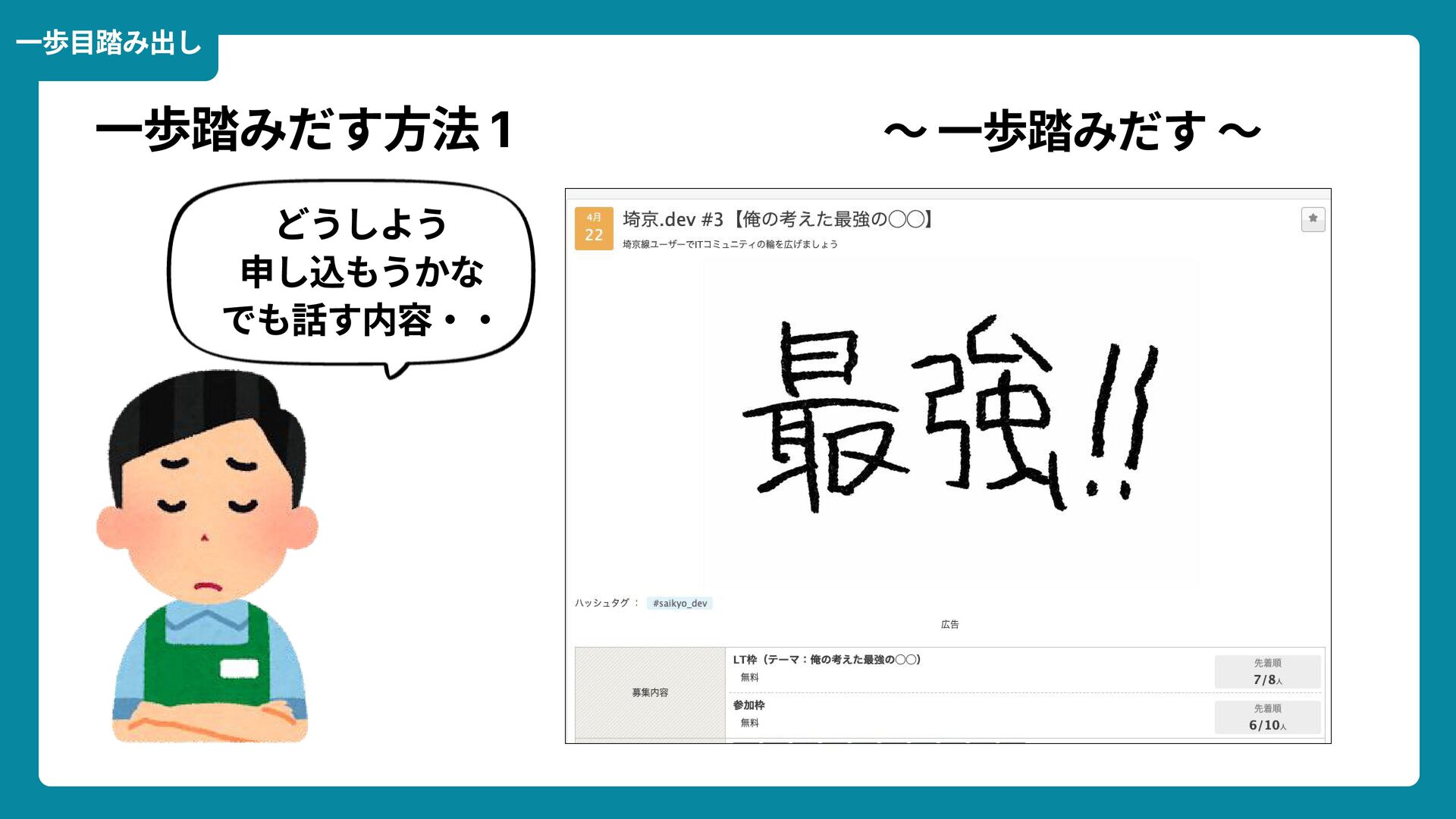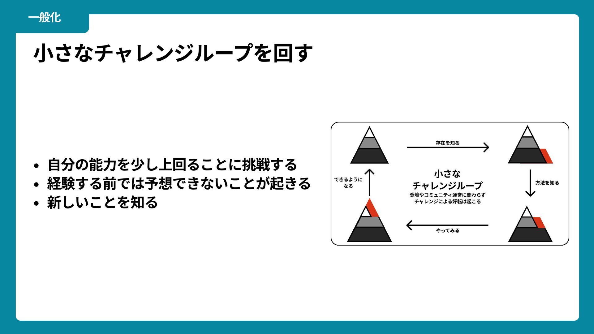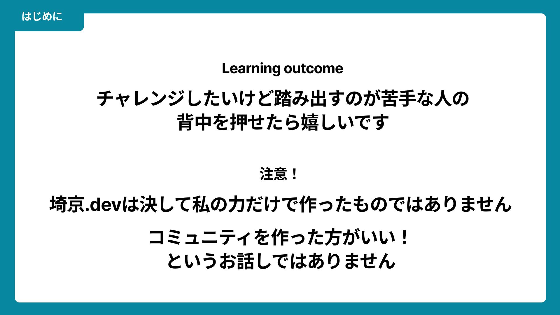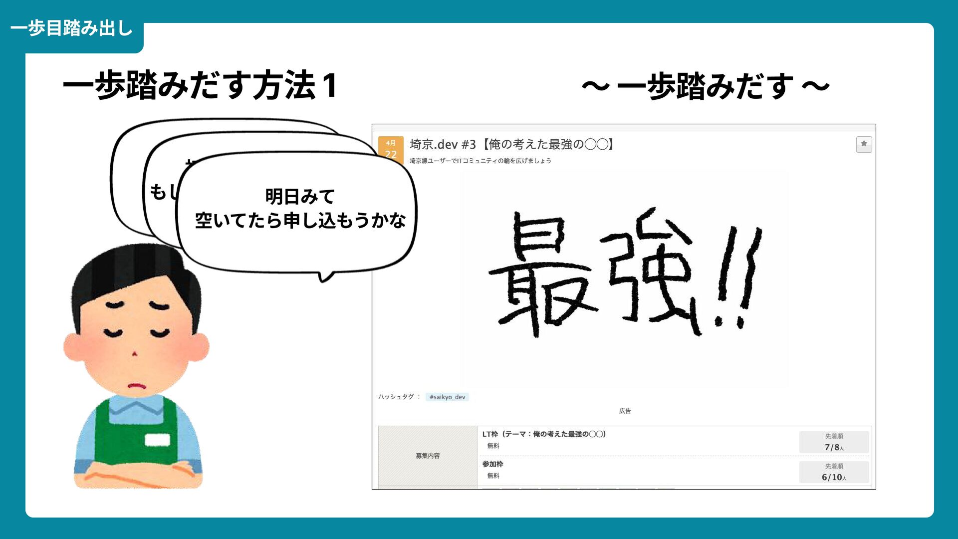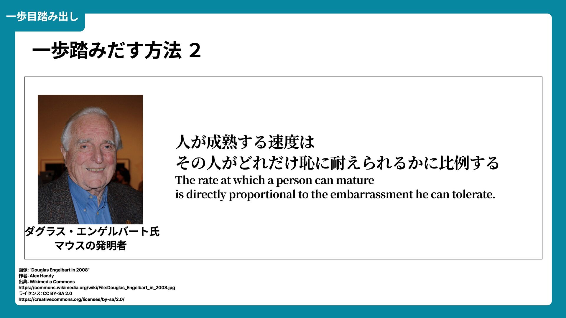 出典: Wikimedia Commons https://commons.wikimedia.org/wiki/File:Douglas_Engelbart_in_2008.jpg ライセンス: CC BY-SA 2.0 https://creativecommons.org/licenses/by-sa/2.0/ 一歩踏みだす方法 2 ダグラス・エンゲルバート氏 マウスの発明者 人が成熟する速度は その人がどれだけ恥に耐えられるかに比例する The rate at which a person can mature is directly proportional to the embarrassment he can tolerate.