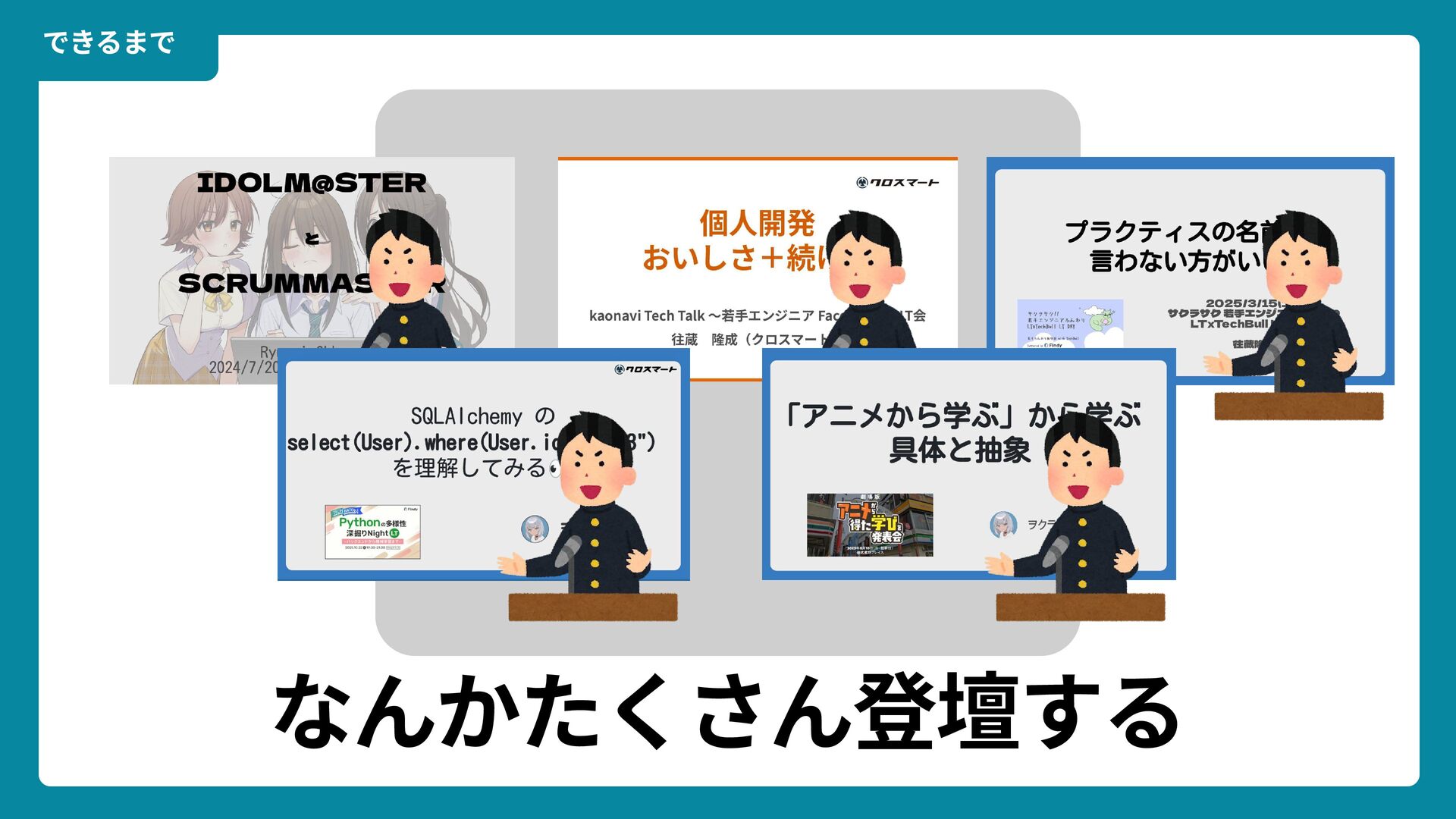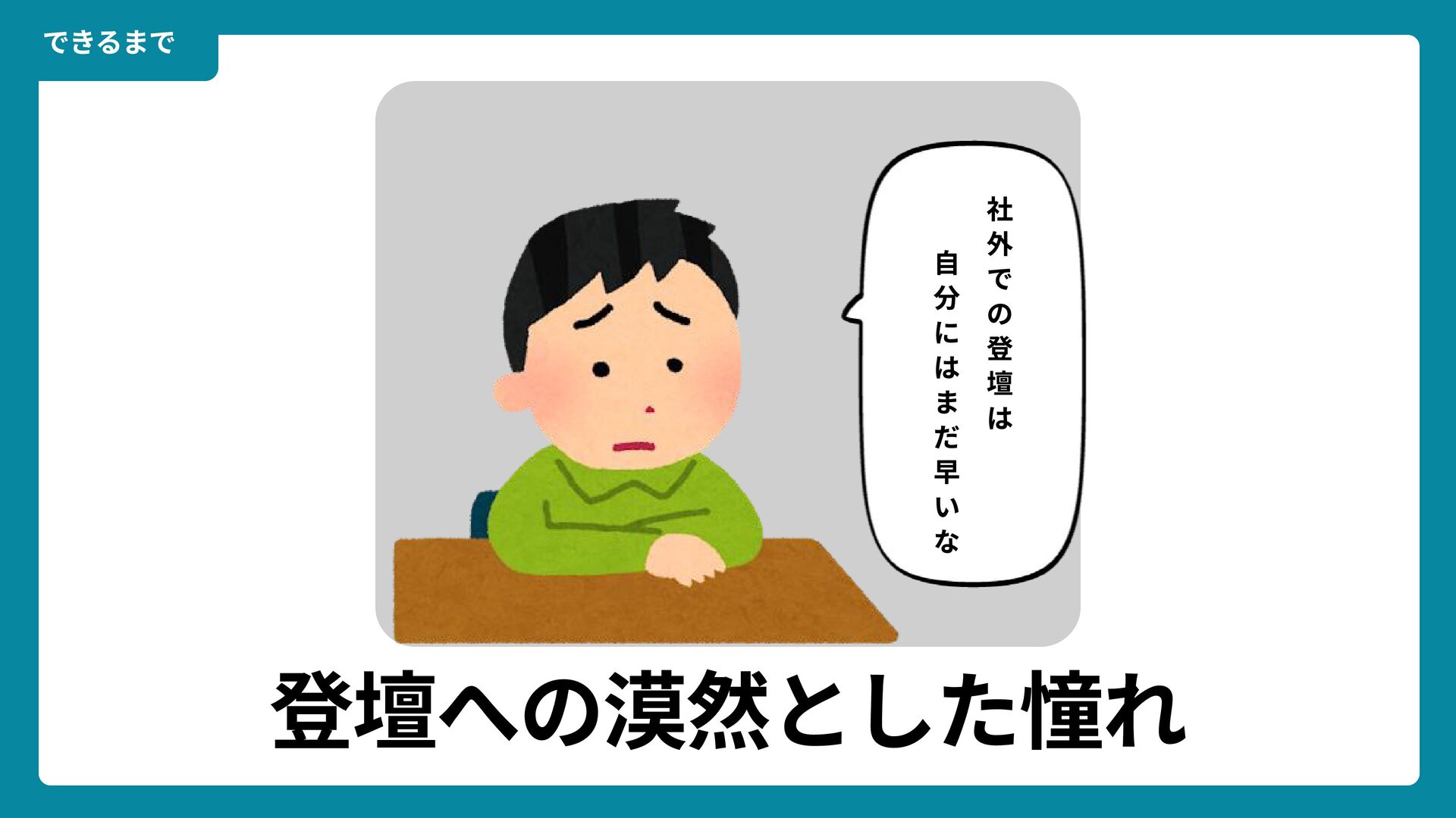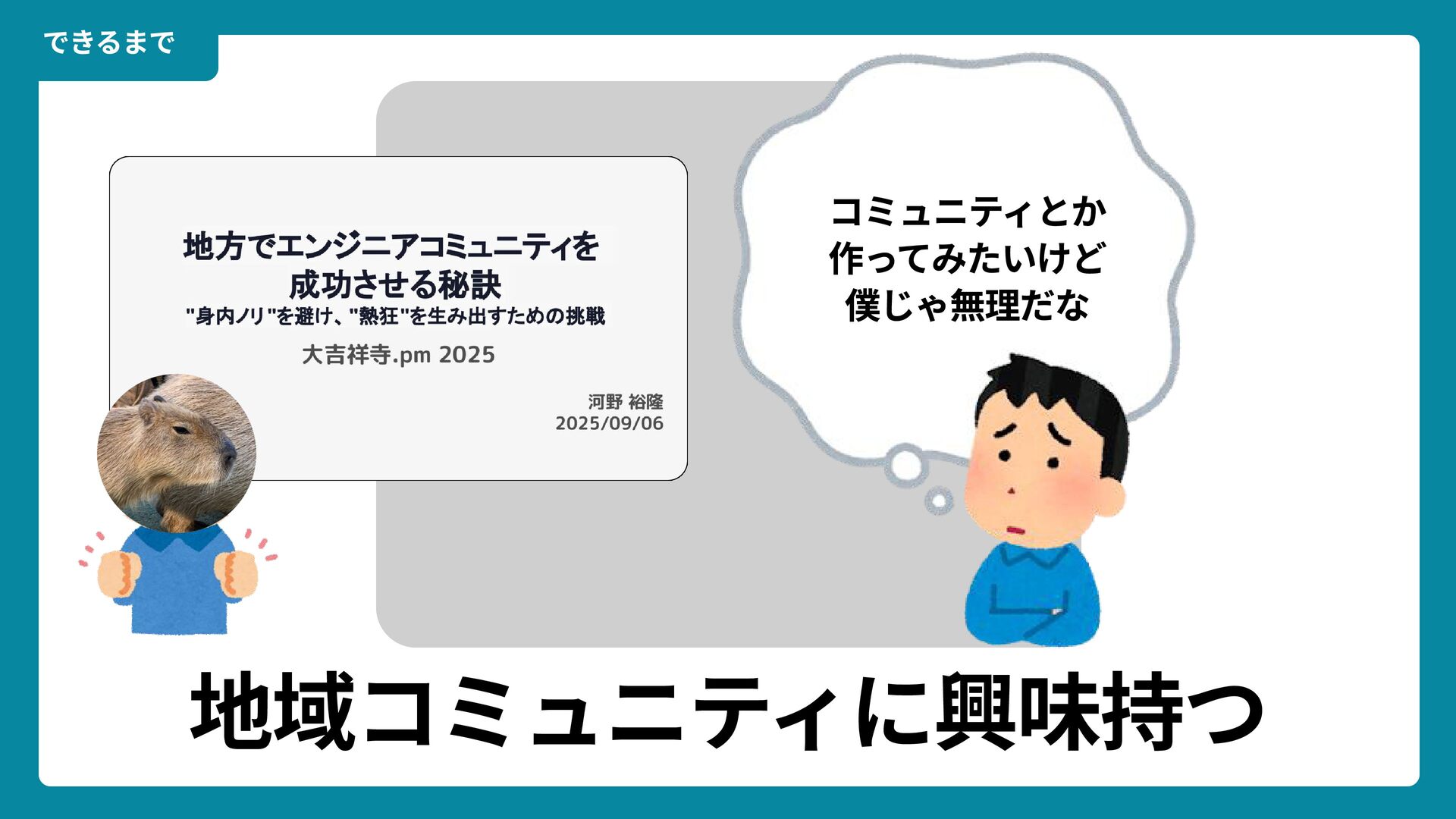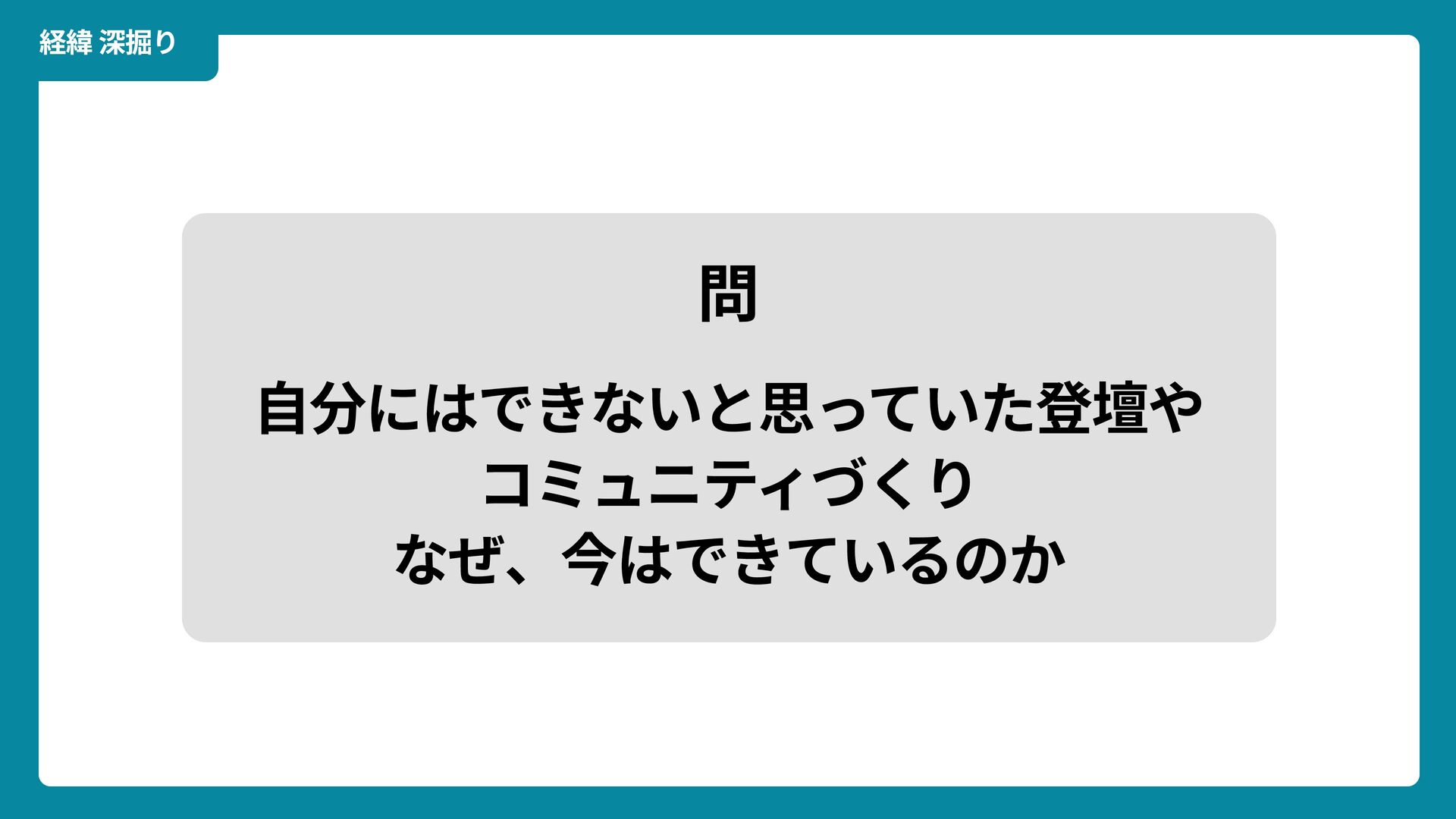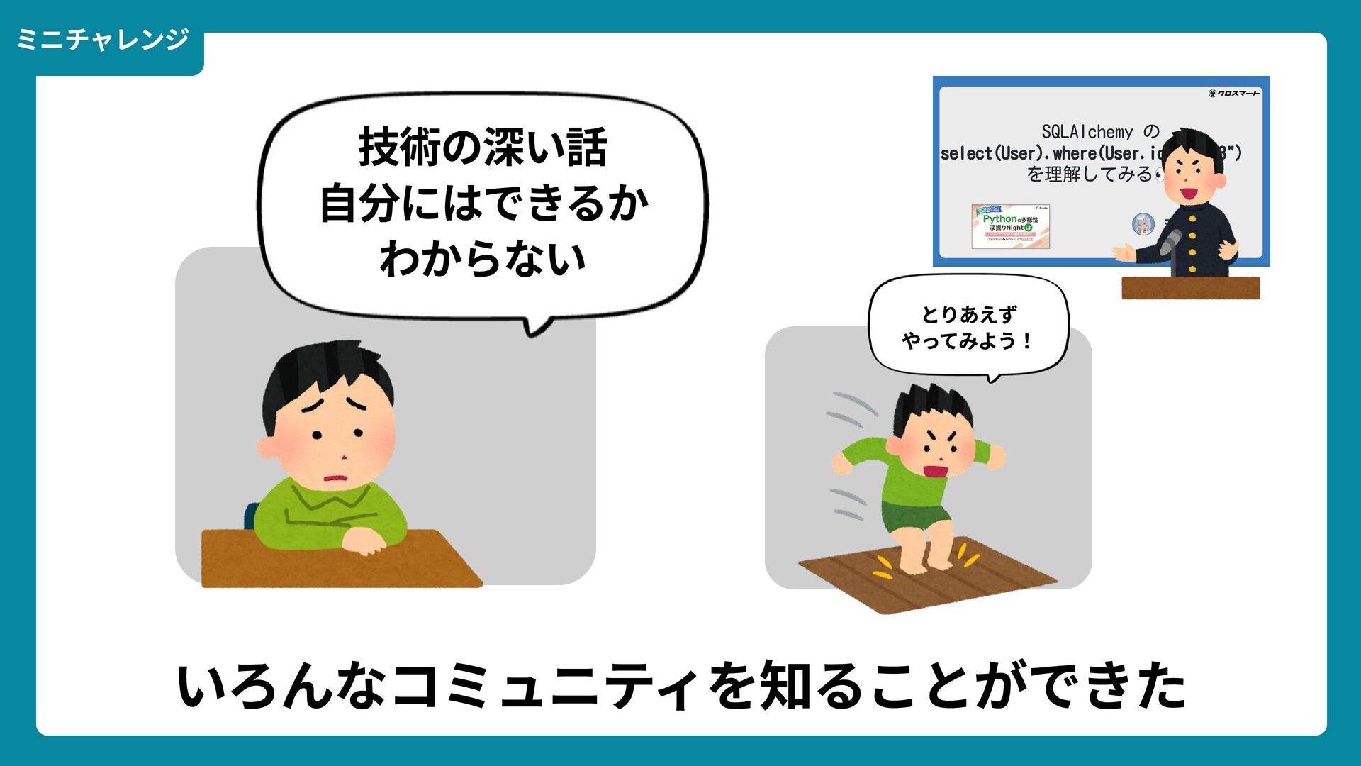 出典: Wikimedia Commons https://commons.wikimedia.org/wiki/File:Douglas_Engelbart_in_2008.jpg ライセンス: CC BY-SA 2.0 https://creativecommons.org/licenses/by-sa/2.0/ 一歩踏みだす方法 2 ダグラス・エンゲルバート氏 マウスの発明者 人が成熟する速度は その人がどれだけ恥に耐えられるかに比例する The rate at which a person can mature is directly proportional to the embarrassment he can tolerate.