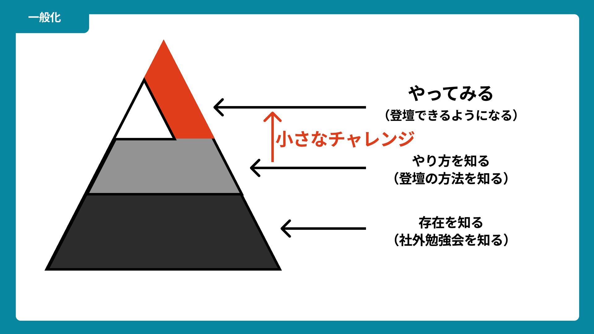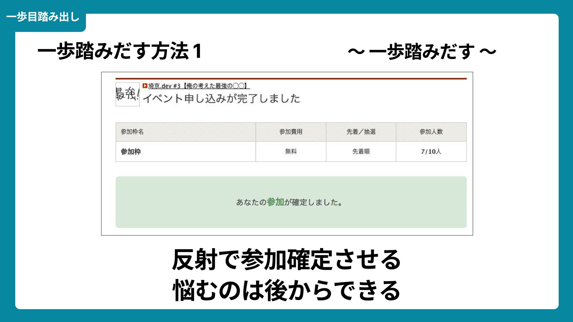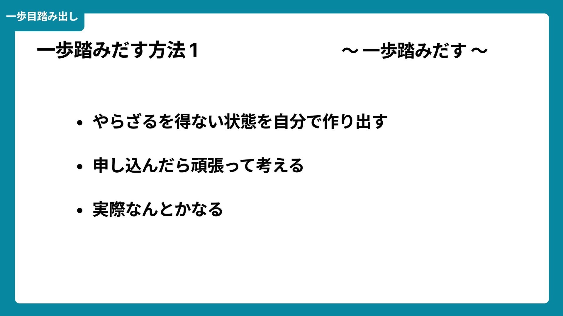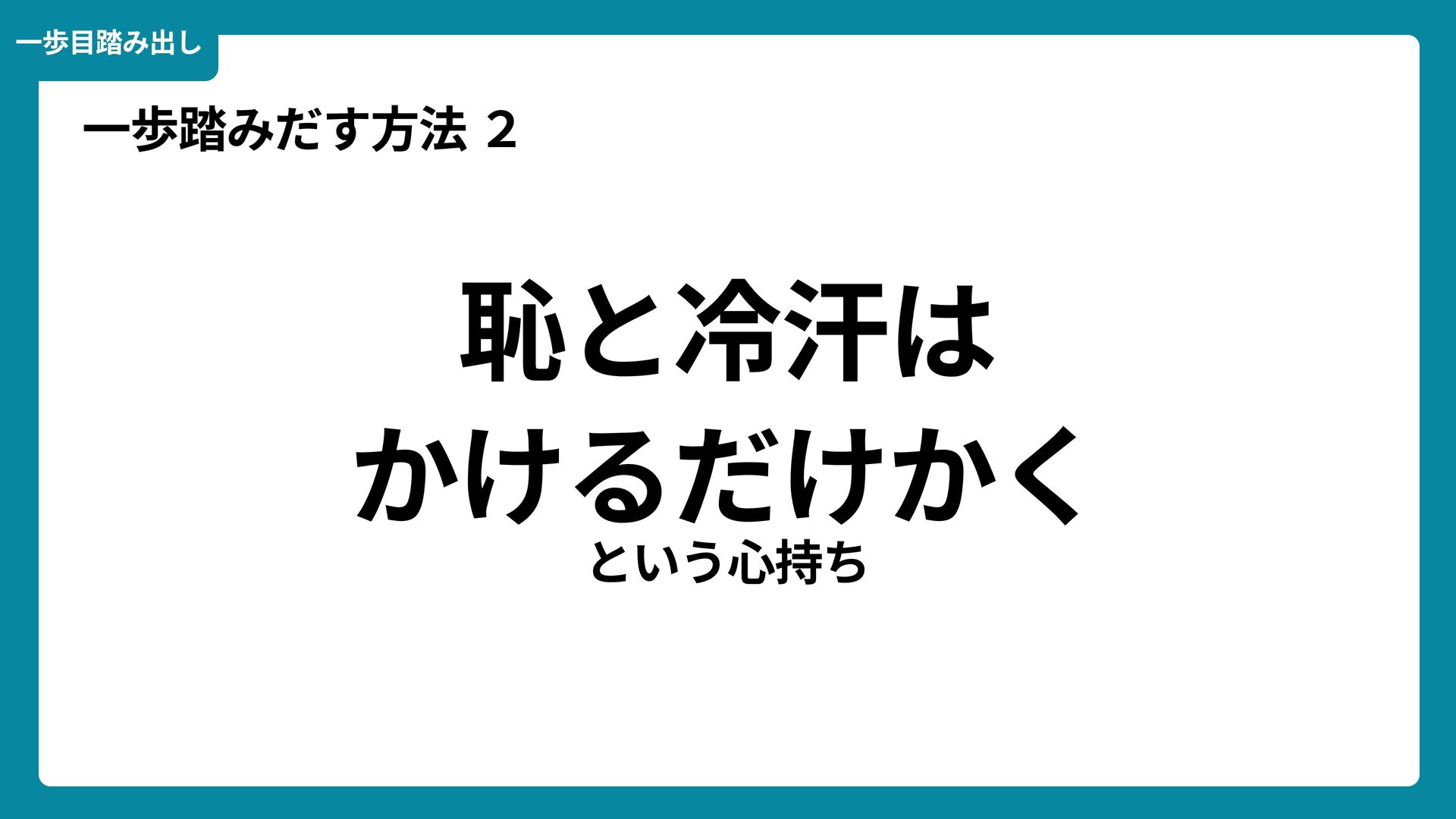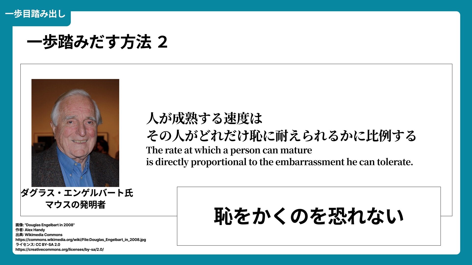 Wikimedia Commons https://commons.wikimedia.org/wiki/File:Douglas_Engelbart_in_2008.jpg ライセンス: CC BY-SA 2.0 https://creativecommons.org/licenses/by-sa/2.0/ 一歩踏みだす方法 2 ダグラス・エンゲルバート氏 マウスの発明者 人が成熟する速度は その人がどれだけ恥に耐えられるかに比例する The rate at which a person can mature is directly proportional to the embarrassment he can tolerate. 恥をかくのを恐れない