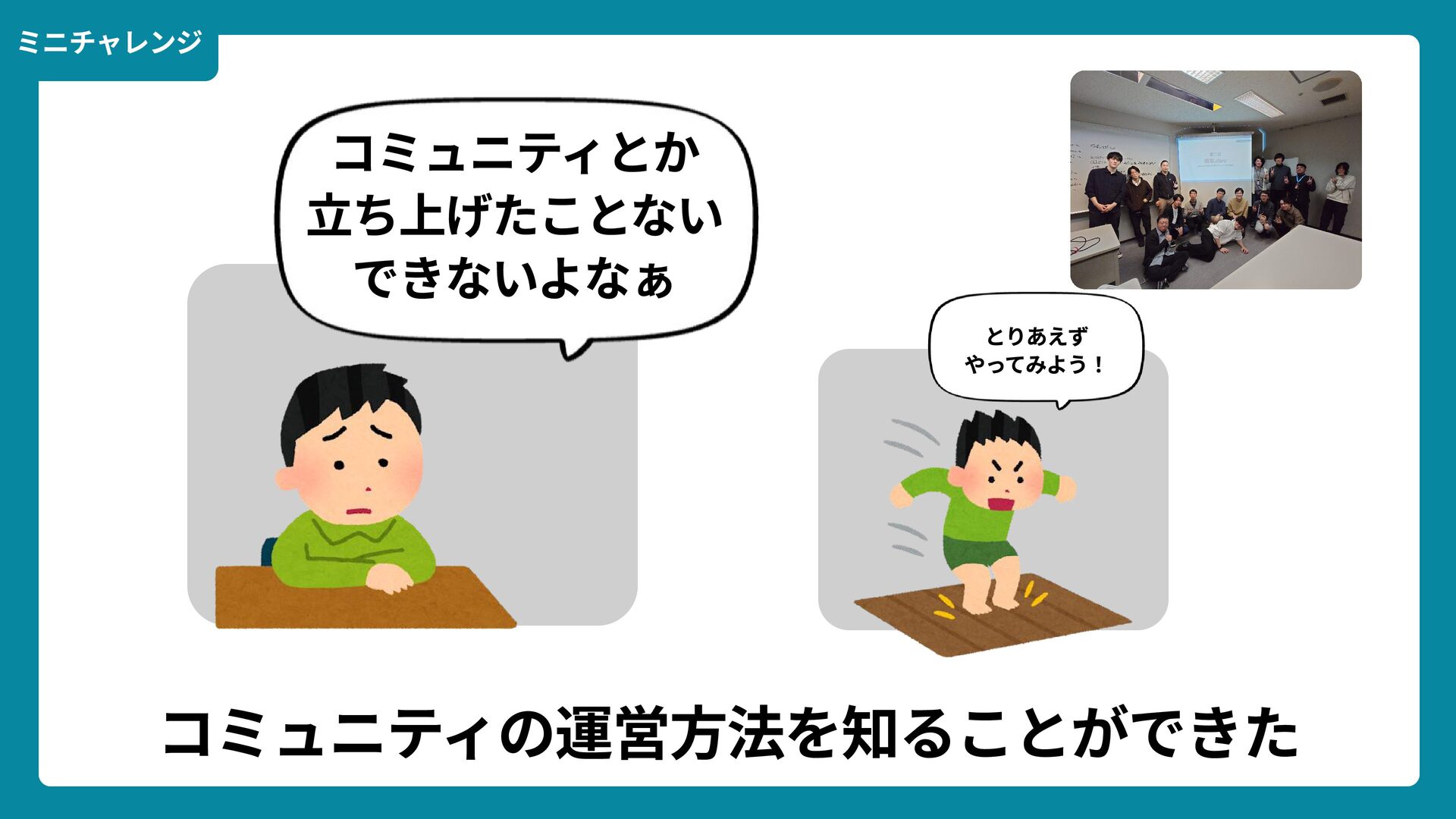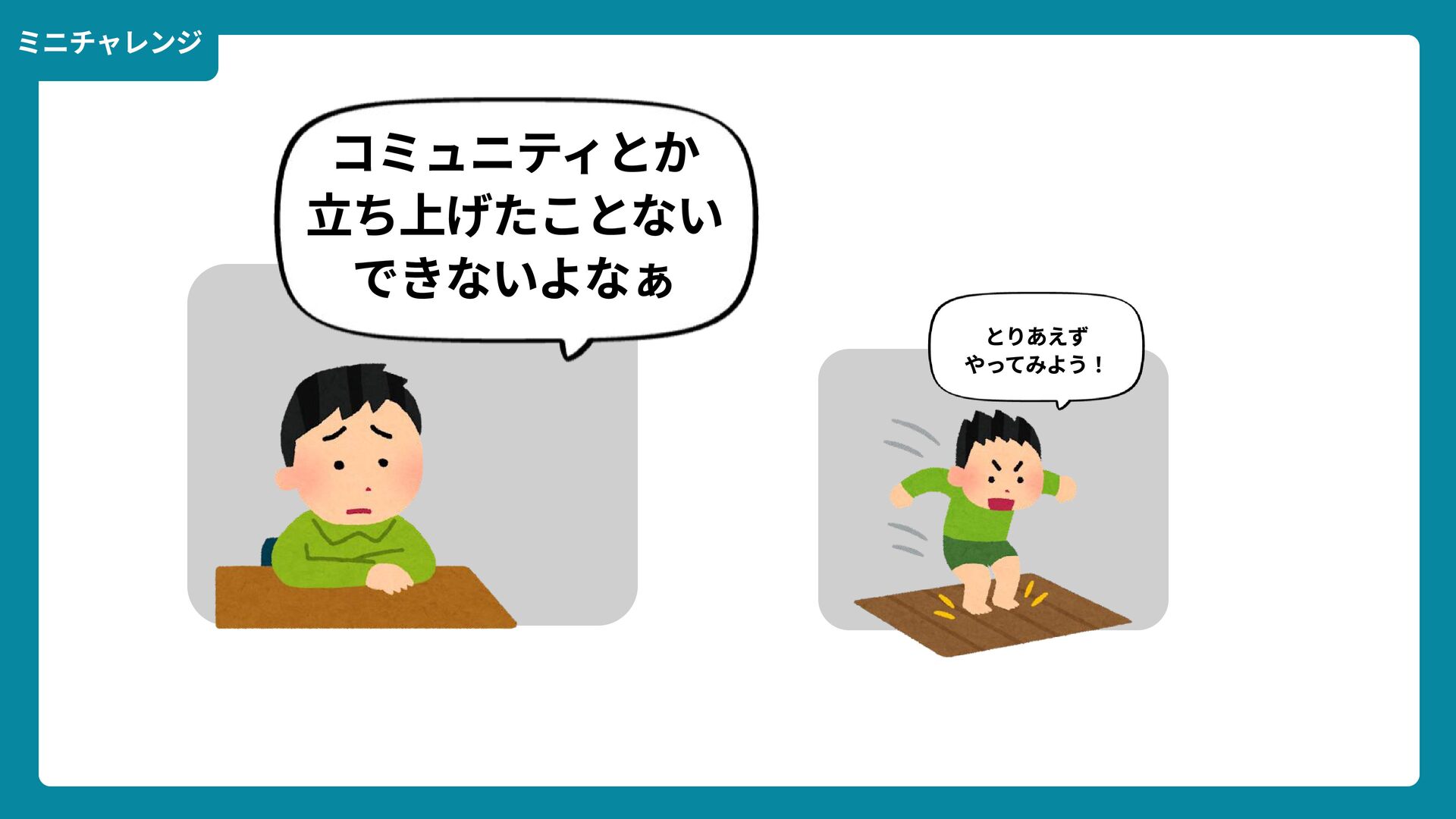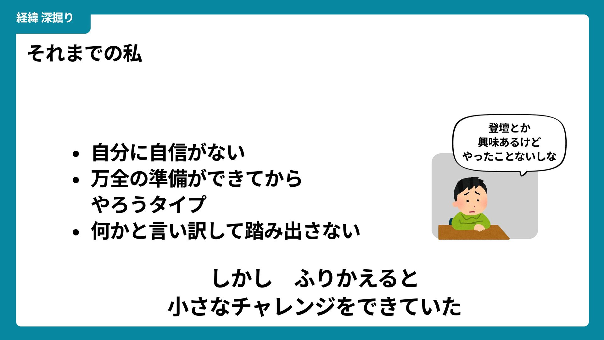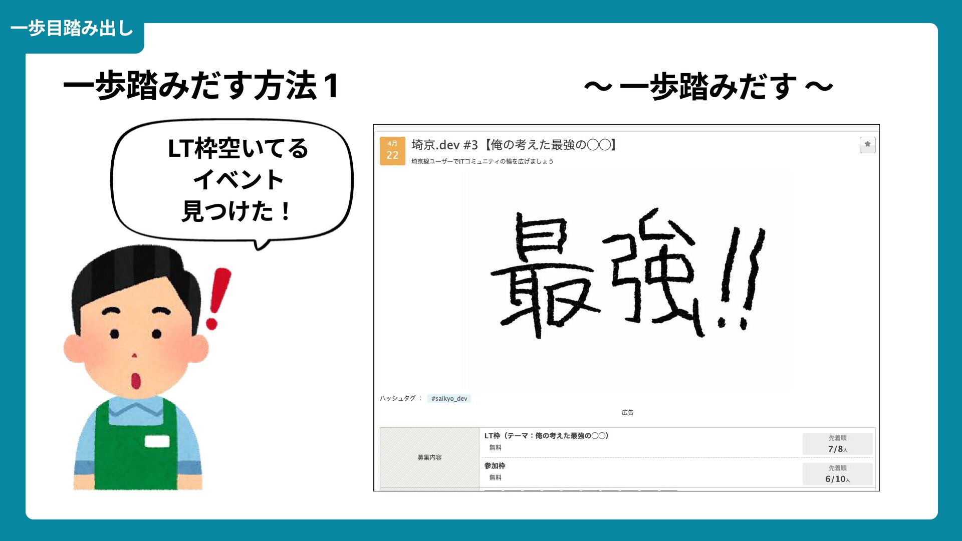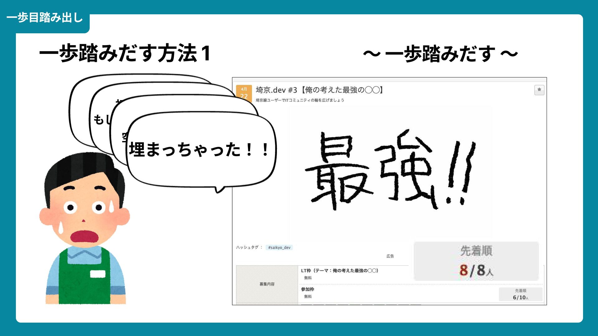 Wikimedia Commons https://commons.wikimedia.org/wiki/File:Douglas_Engelbart_in_2008.jpg ライセンス: CC BY-SA 2.0 https://creativecommons.org/licenses/by-sa/2.0/ 一歩踏みだす方法 2 ダグラス・エンゲルバート氏 マウスの発明者 人が成熟する速度は その人がどれだけ恥に耐えられるかに比例する The rate at which a person can mature is directly proportional to the embarrassment he can tolerate. 恥をかくのを恐れない