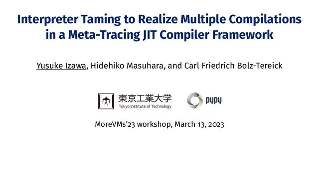 so long on tracing recursive calls pc = 0; bytecode = [..]; stack = [..] while True: instr = bytecode[pc++] if instr == INT: n = ord(bytecode[pc++]) push(stack, n) elif instr == LT: y, x = pop(stack), pop(stack) if x < y: push(stack, True) else: push(stack, False) elif instr == JUMP_IF: if not top(stack): pc = bytecode[pc++] elif instr == JUMP_BACK: pc = bytecode[pc++] elif instr == CALL: target = bytecode[pc++] r = interp(stack, target) push(r) elif .. def sum(x): if x < 1: return 1 else: return n + sum(n-1) v4 = list_read(v3, v0) v5 = add(v0, 1) guard_eq(v4, LT) v6 = add(v5, 1) v7 = list_pop(v1) v8 = list_pop(v1) guard_type(v7, int) guard_type(v8, int) guard_not_less_than(v7, v8) list_append(v1, False) v10 = list_read(v3, v0) guard_eq(v10, DUP) ... guard_eq(v18, SUB) ... guard_ed(v26, CALL) ... (inlined) ... guard_eq(v34, DUP) ... auard_eq(v42, SUB) ... ... (stop inlining) ... ... guard_eq(v58, CALL) v1092 = call("sum", ..) ... finish(v2000) Interpreter Taming to Realize Multiple Compilations in a Meta-Tracing JIT Compiler Framework MoreVMs’23 1/6
