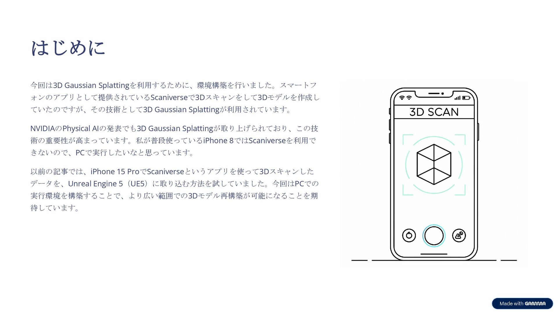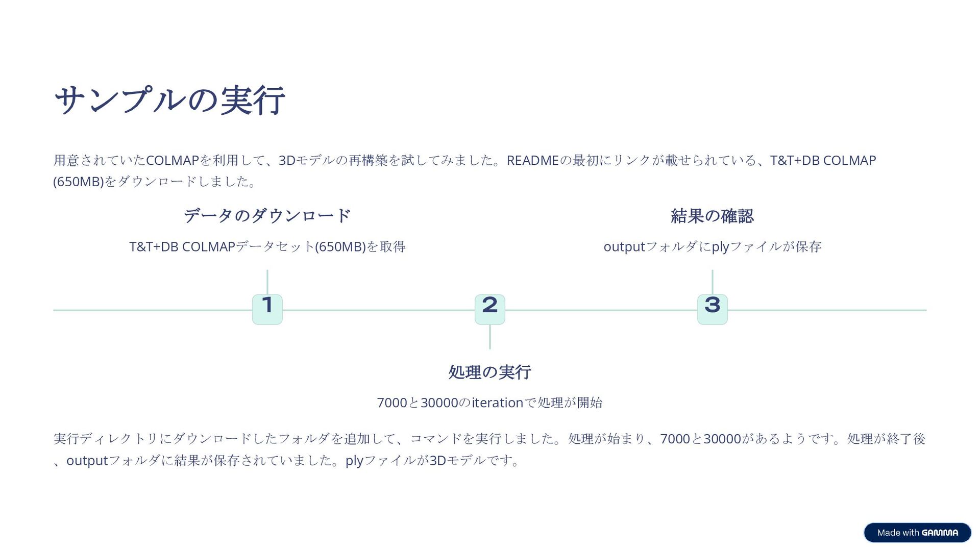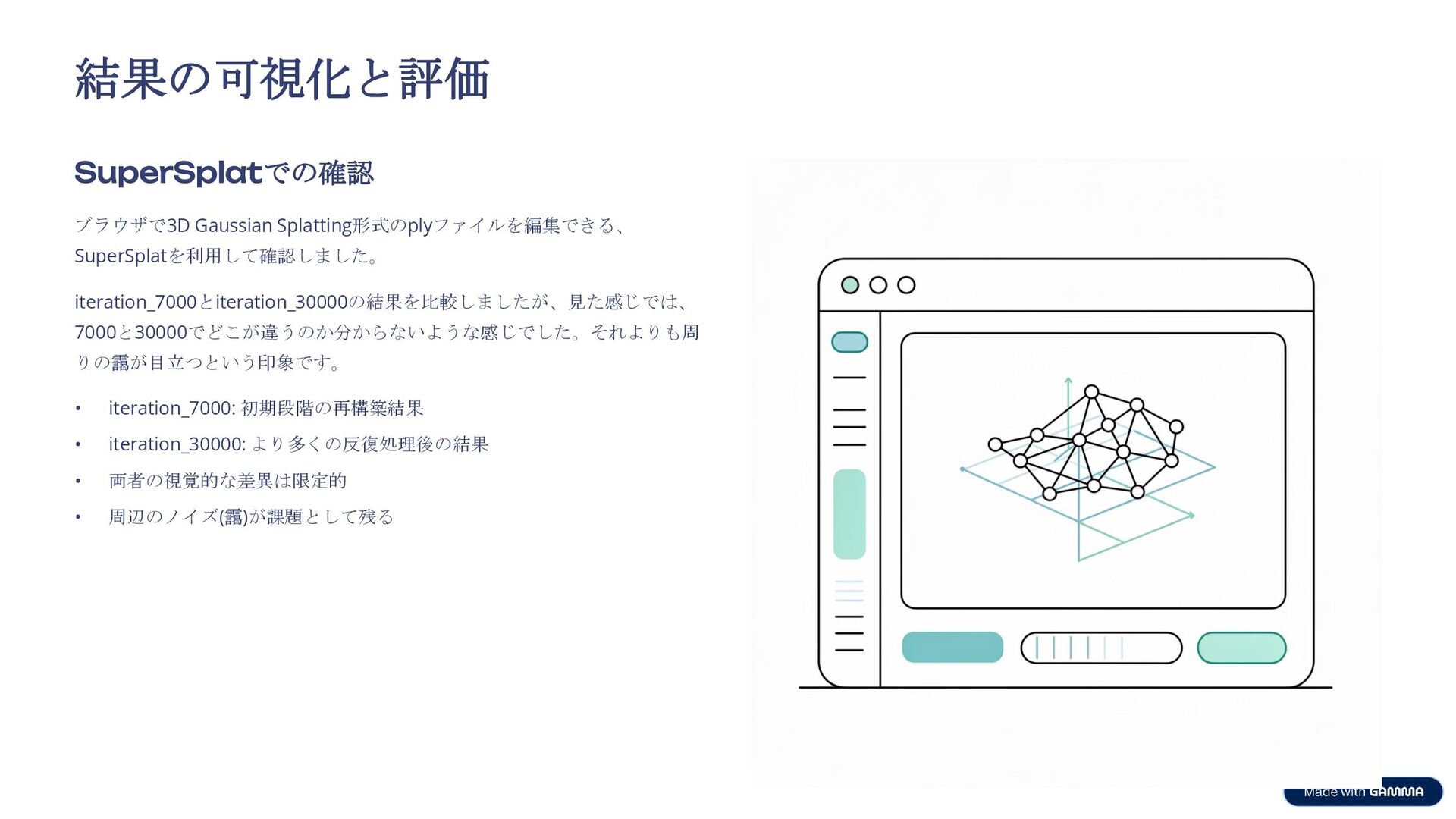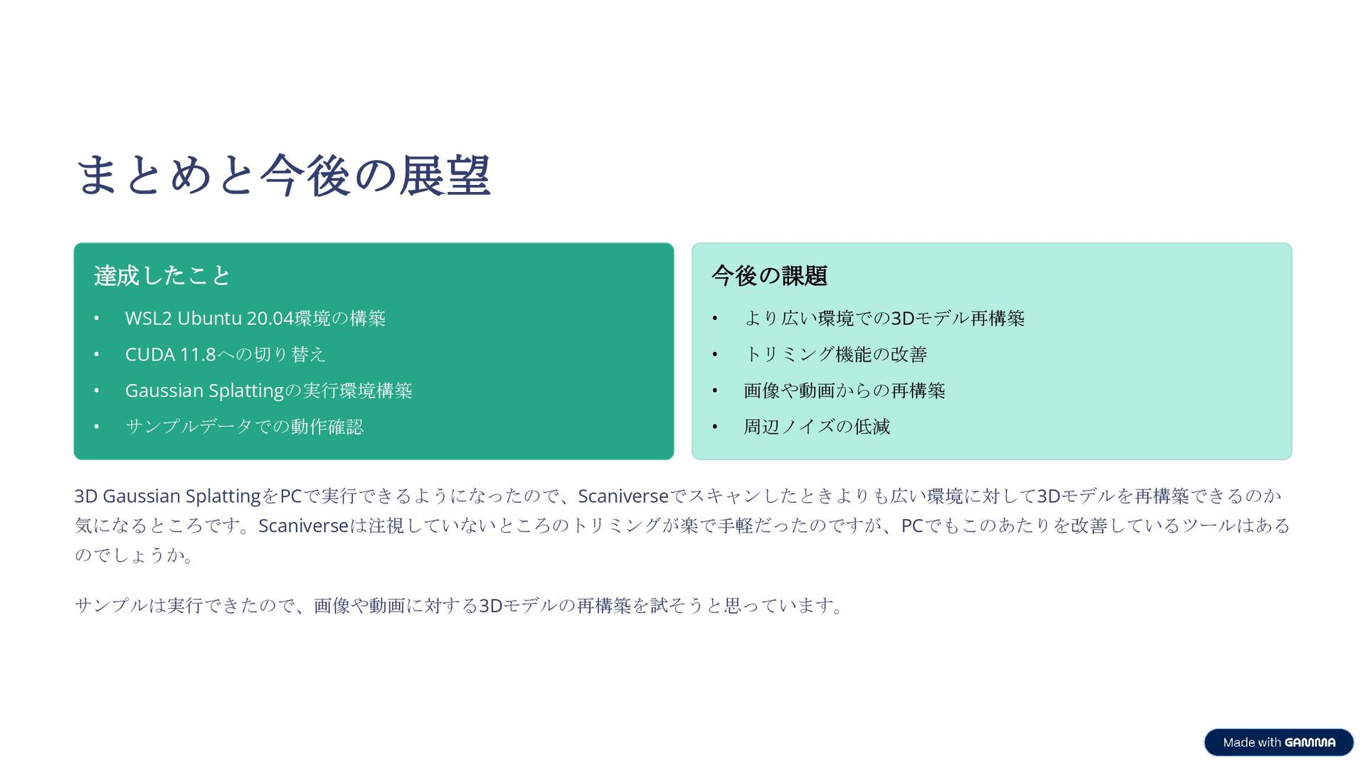 • Gaussian Splattingの実行環境構築 • サンプルデータでの動作確認 今後の課題 • より広い環境での3Dモデル再構築 • トリミング機能の改善 • 画像や動画からの再構築 • 周辺ノイズの低減 3D Gaussian SplattingをPCで実行できるようになったので、Scaniverseでスキャンしたときよりも広い環境に対して3Dモデルを再構築できるのか 気になるところです。Scaniverseは注視していないところのトリミングが楽で手軽だったのですが、PCでもこのあたりを改善しているツールはある のでしょうか。 サンプルは実行できたので、画像や動画に対する3Dモデルの再構築を試そうと思っています。