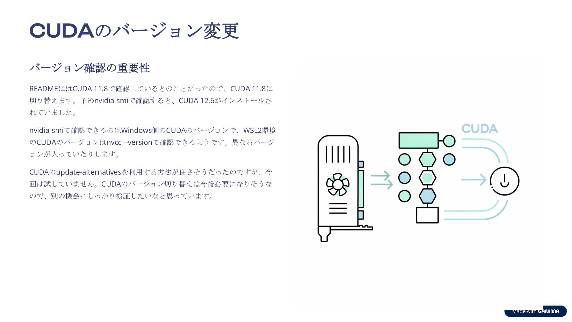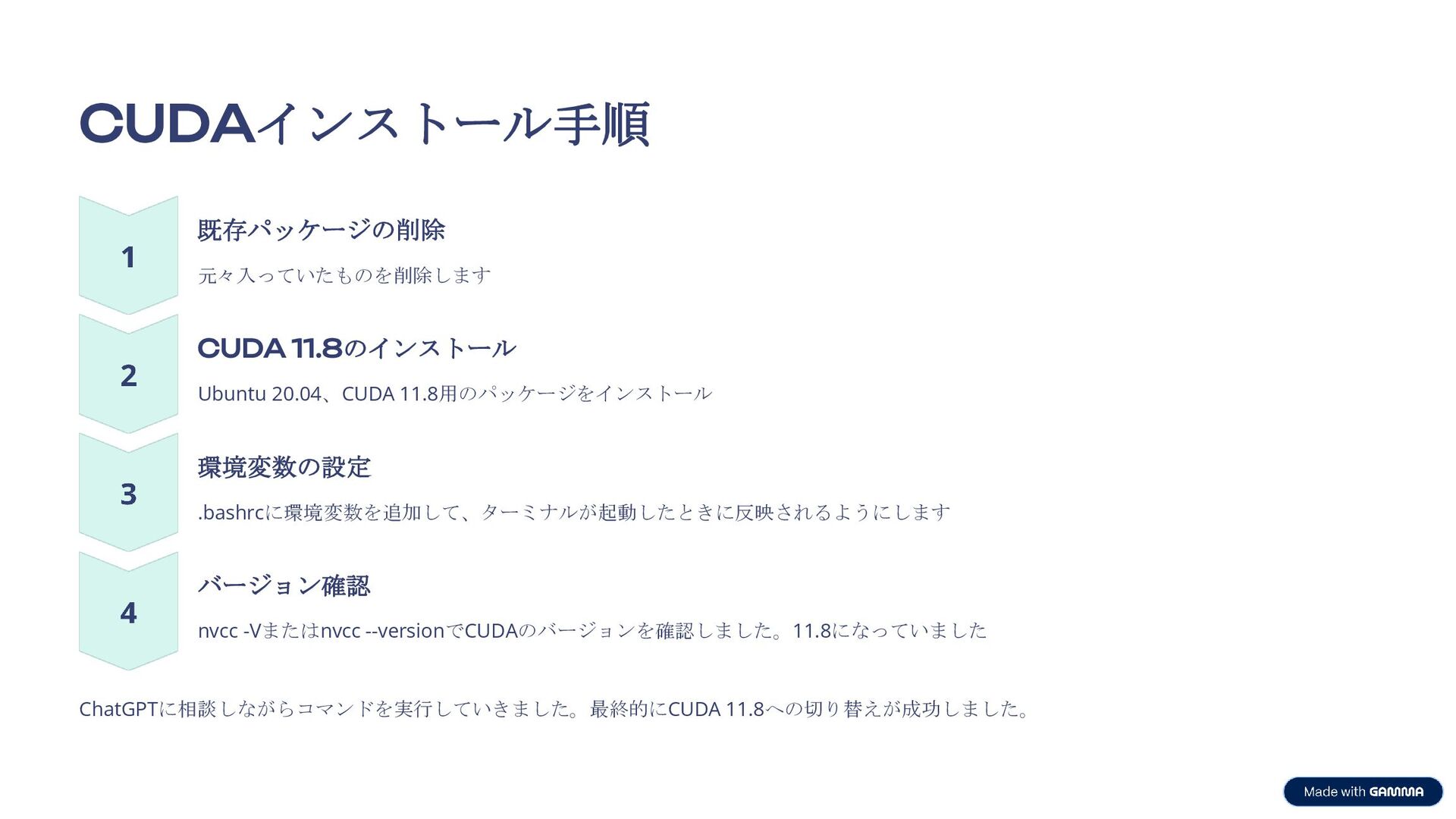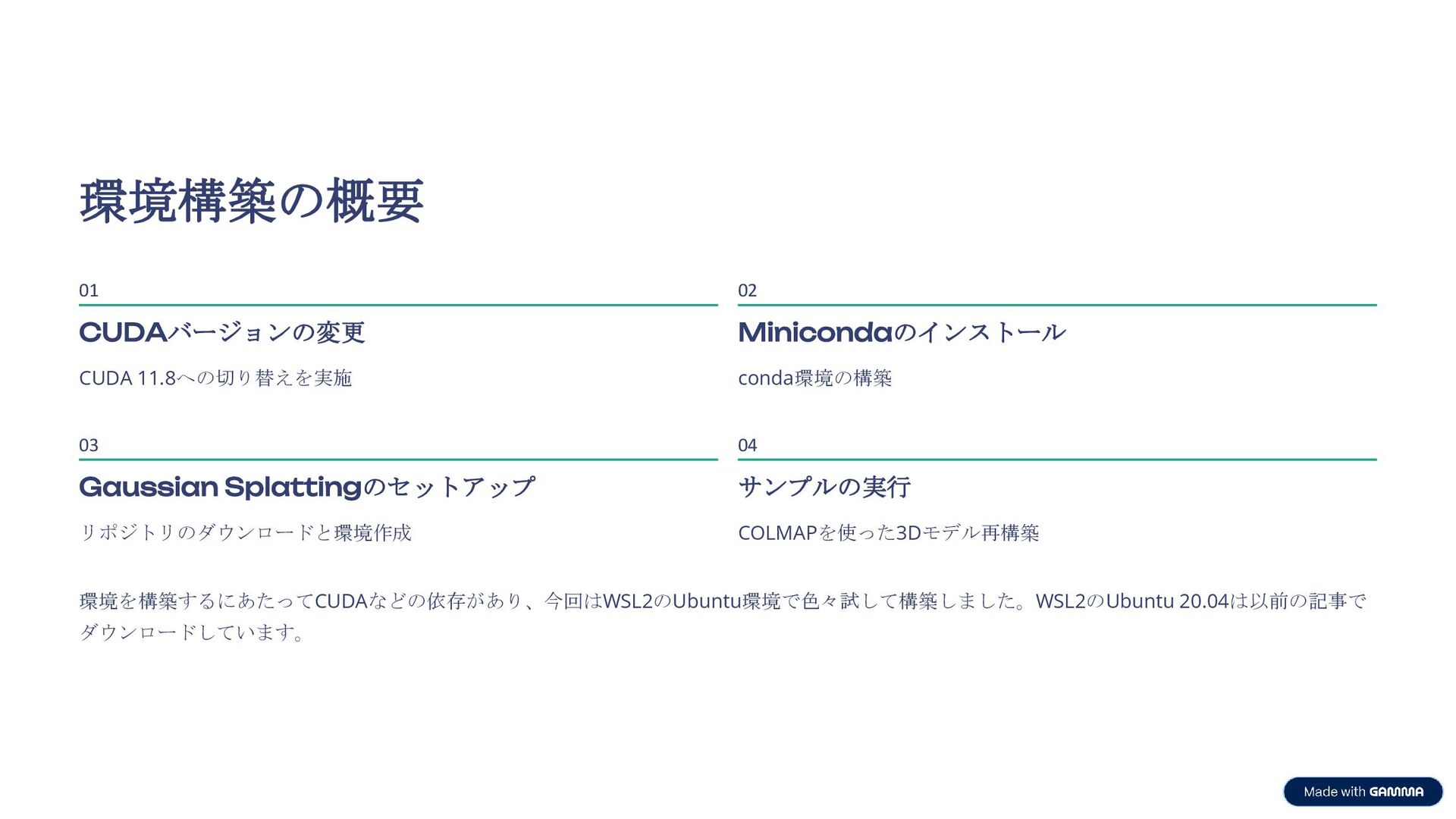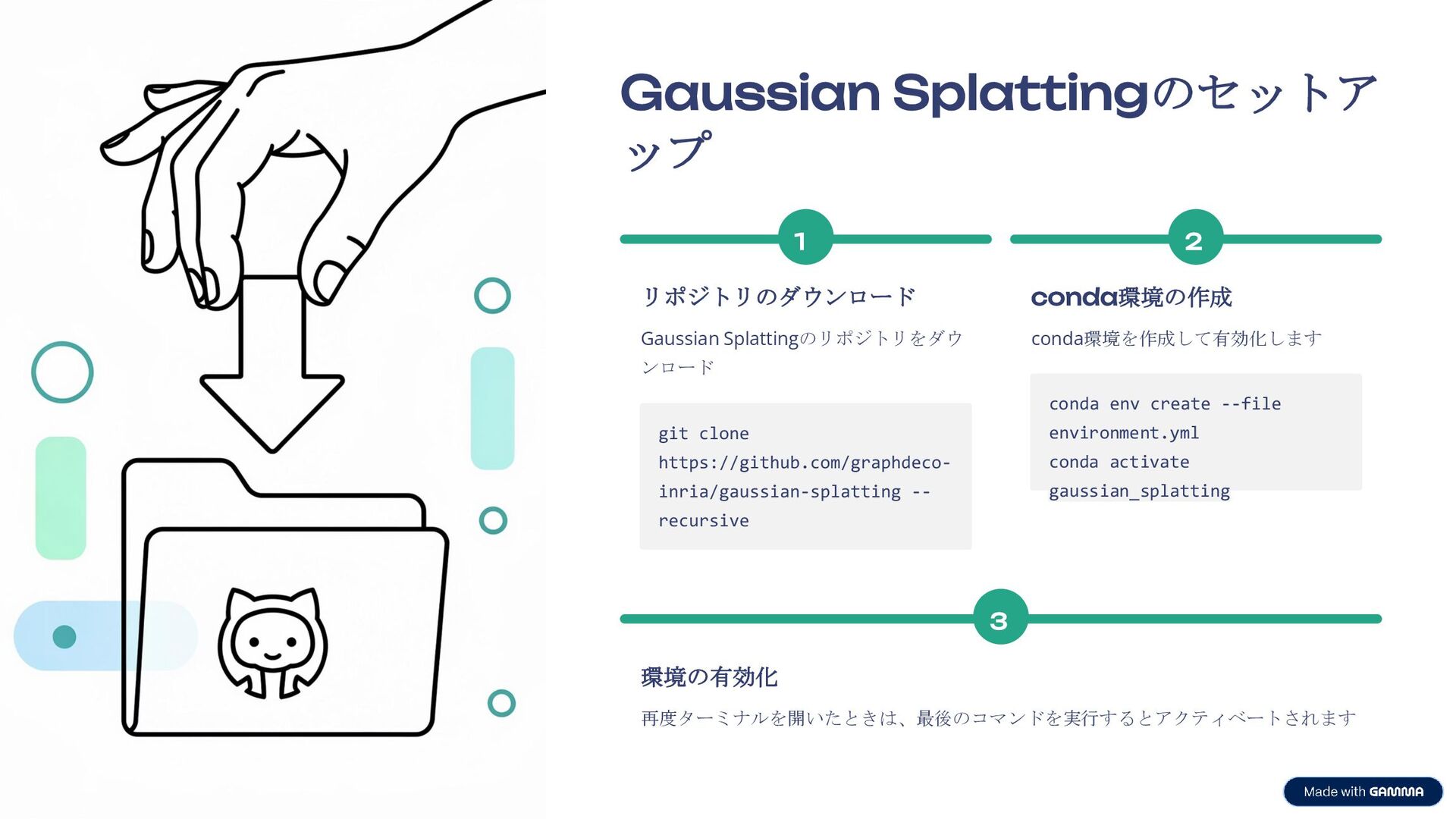 • Gaussian Splattingの実行環境構築 • サンプルデータでの動作確認 今後の課題 • より広い環境での3Dモデル再構築 • トリミング機能の改善 • 画像や動画からの再構築 • 周辺ノイズの低減 3D Gaussian SplattingをPCで実行できるようになったので、Scaniverseでスキャンしたときよりも広い環境に対して3Dモデルを再構築できるのか 気になるところです。Scaniverseは注視していないところのトリミングが楽で手軽だったのですが、PCでもこのあたりを改善しているツールはある のでしょうか。 サンプルは実行できたので、画像や動画に対する3Dモデルの再構築を試そうと思っています。