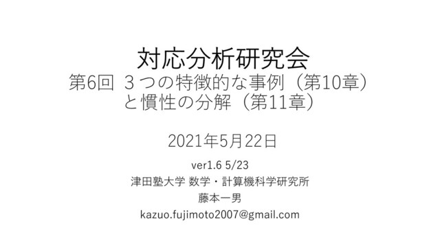 対応分析研究会 第6回 3つの特徴的な事例(第10章) と慣性の分解(第11章) 2021年5⽉22⽇ ver1.6 5/23 津⽥塾⼤学 数学・計算機科学研究所 藤本⼀男