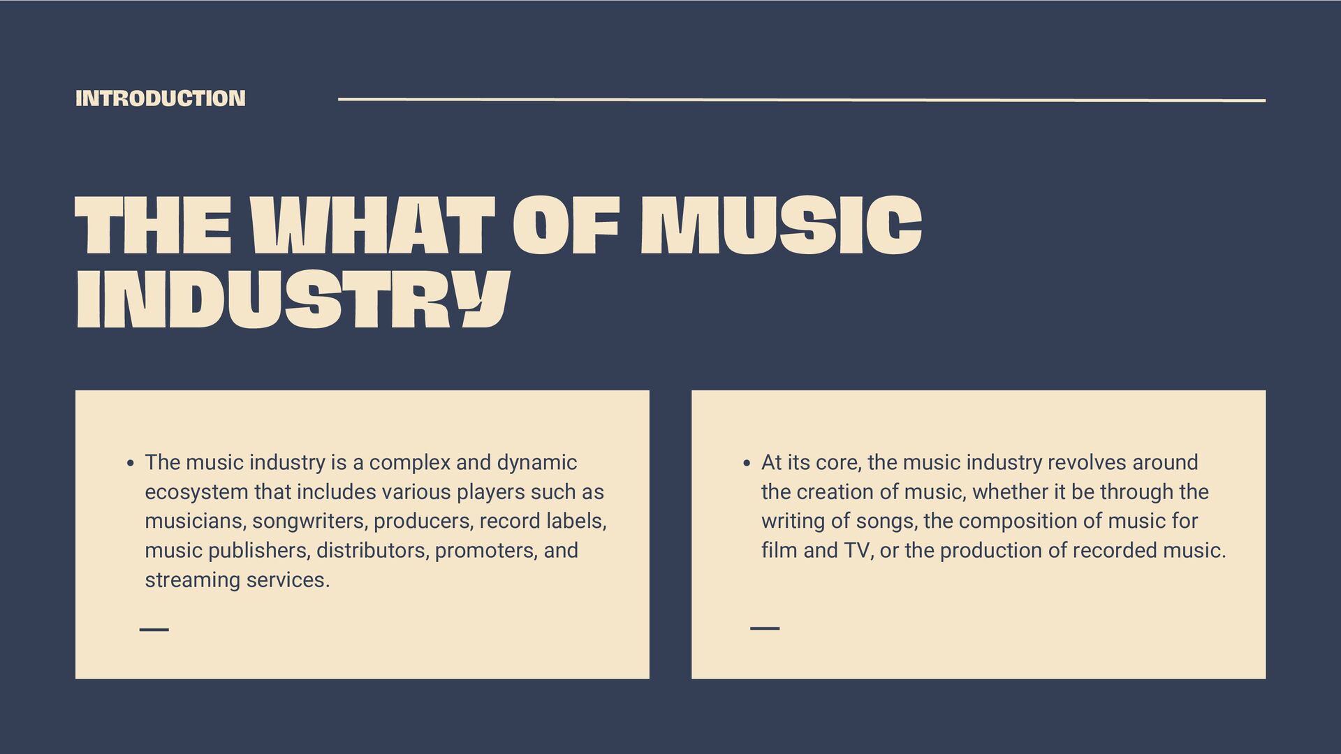 music industry revolves around the creation of music, whether it be through the writing of songs, the composition of music for film and TV, or the production of recorded music. The music industry is a complex and dynamic ecosystem that includes various players such as musicians, songwriters, producers, record labels, music publishers, distributors, promoters, and streaming services.