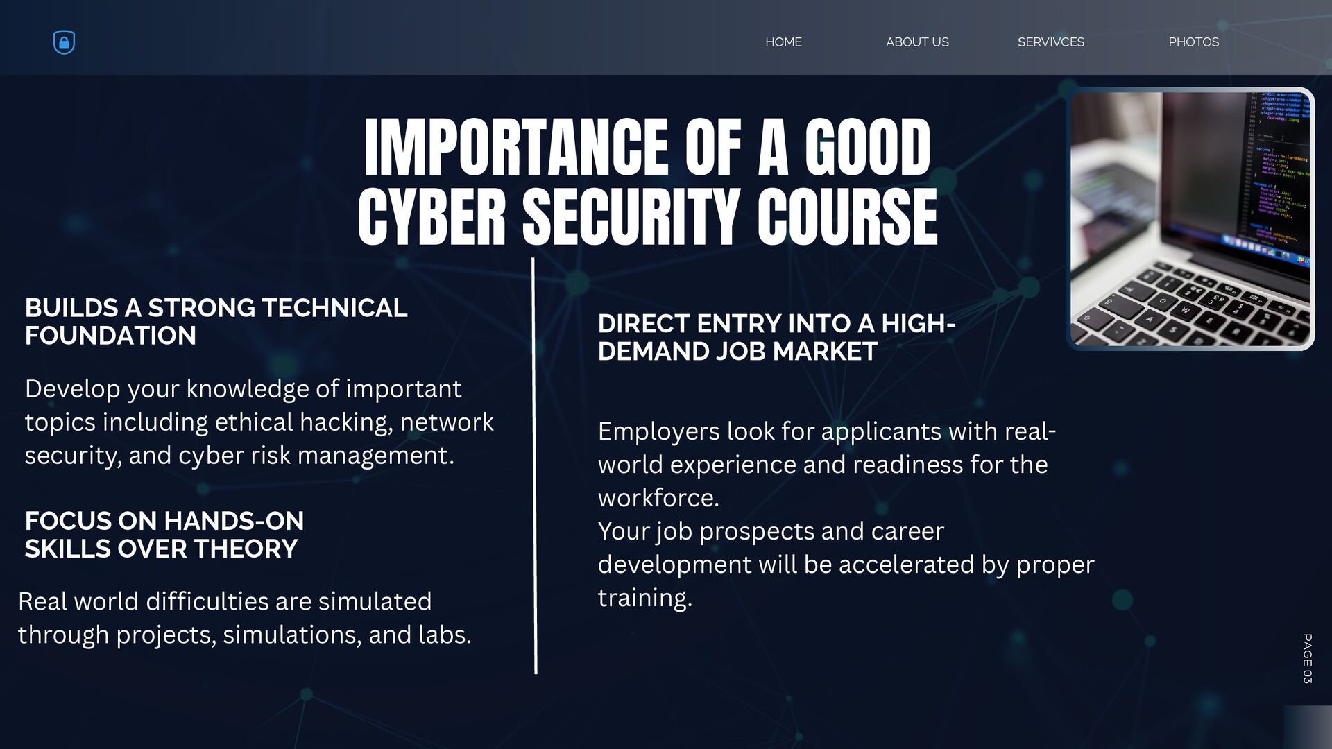 SERVIVCES PHOTOS PAGE 03 BUILDS A STRONG TECHNICAL FOUNDATION FOCUS ON HANDS-ON SKILLS OVER THEORY Develop your knowledge of important topics including ethical hacking, network security, and cyber risk management. Real world difficulties are simulated through projects, simulations, and labs. DIRECT ENTRY INTO A HIGH- DEMAND JOB MARKET Employers look for applicants with real- world experience and readiness for the workforce. Your job prospects and career development will be accelerated by proper training.