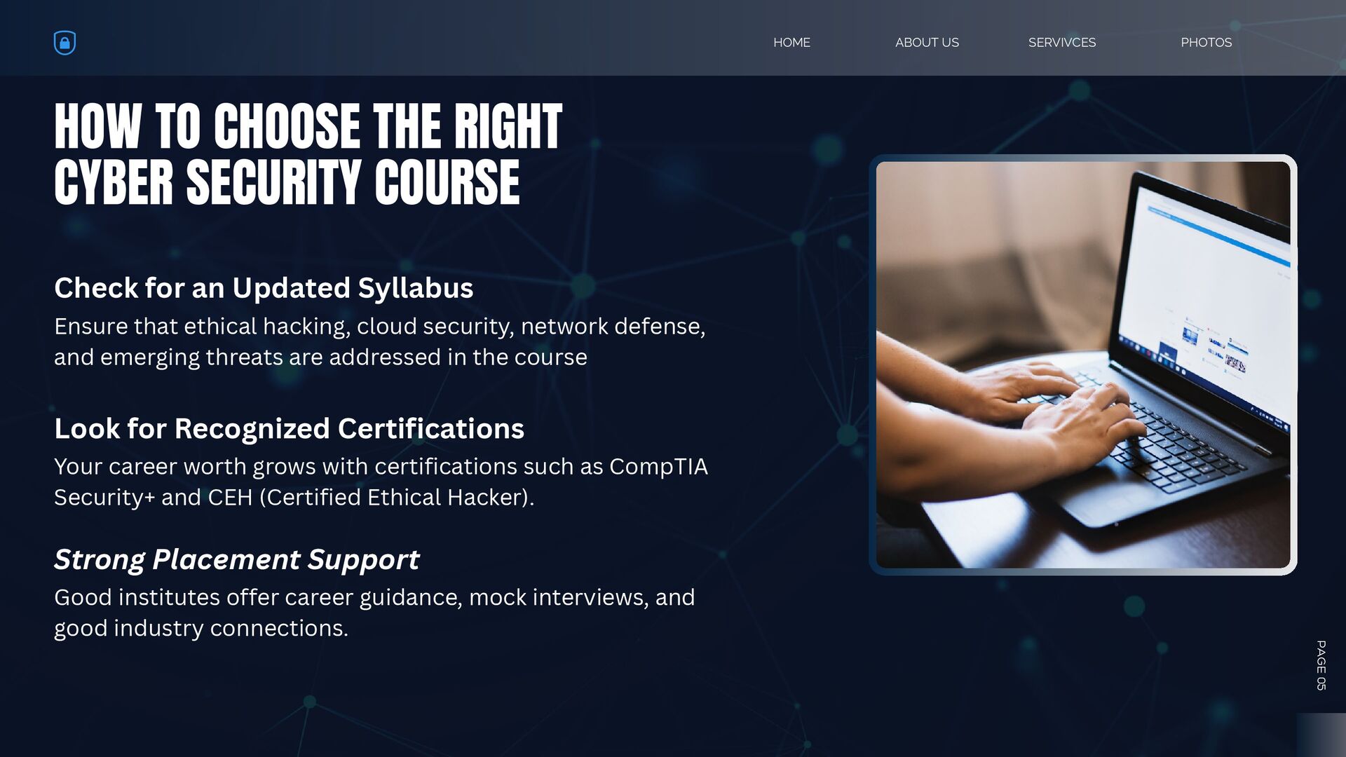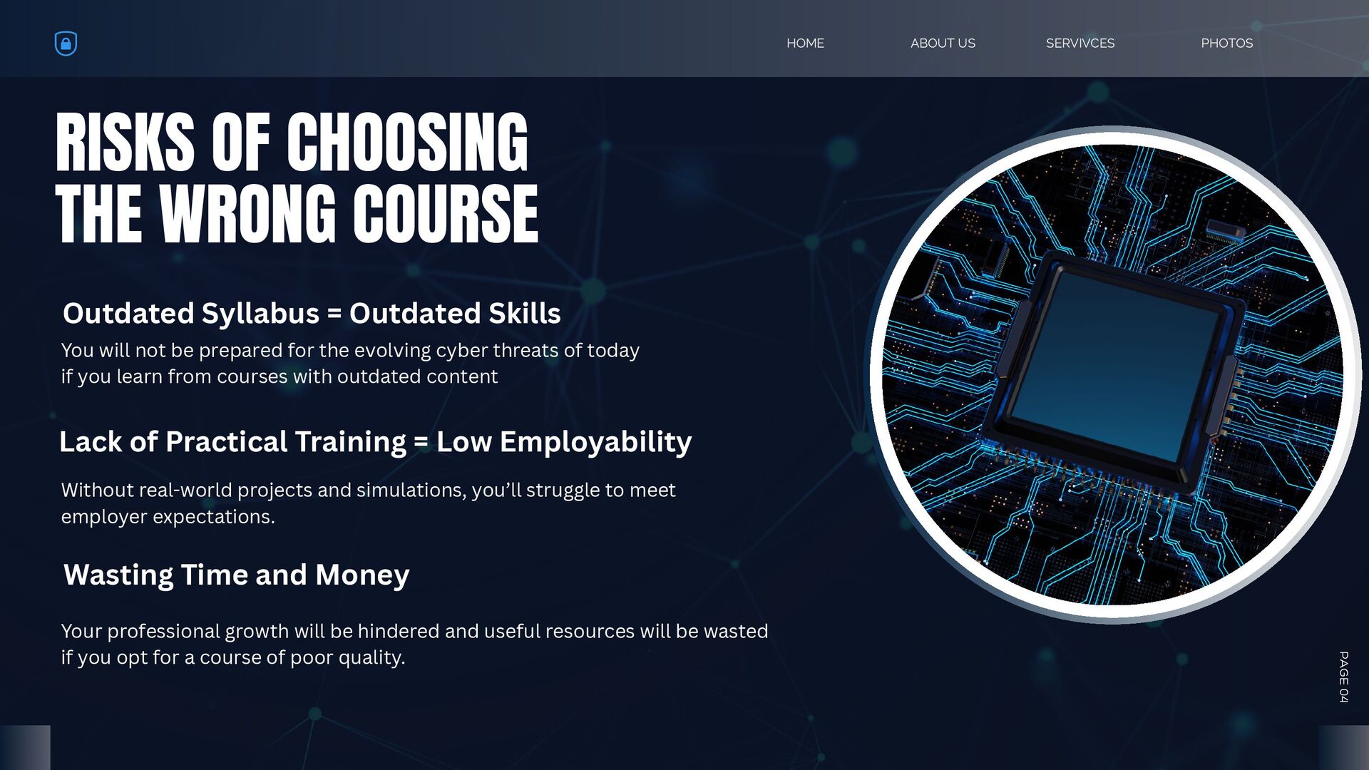 PHOTOS PAGE 04 Outdated Syllabus = Outdated Skills You will not be prepared for the evolving cyber threats of today if you learn from courses with outdated content Lack of Practical Training = Low Employability Without real-world projects and simulations, you’ll struggle to meet employer expectations. Wasting Time and Money Your professional growth will be hindered and useful resources will be wasted if you opt for a course of poor quality.
